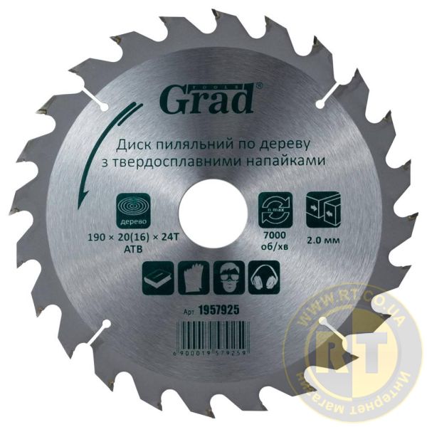 Диск пильный по дереву с твердосплавными напайками 190×32(20;16)×24T GRAD (1957925)