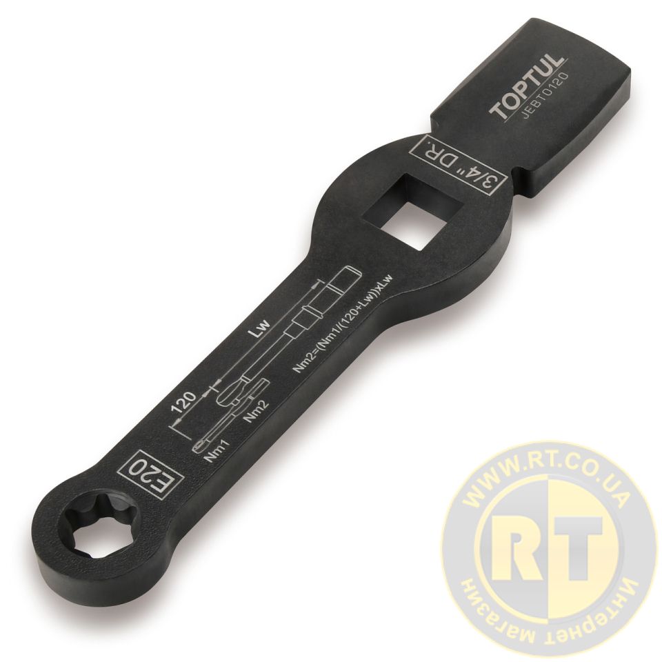TOPTUL JEBT0120 — специализированный ударный ключ с профилем E20 и квадратом 3/4", предназначенный для демонтажа и монтажа тормозных суппортов на коммерческих автомобилях MAN TGL/TGM без необходимости снимать.