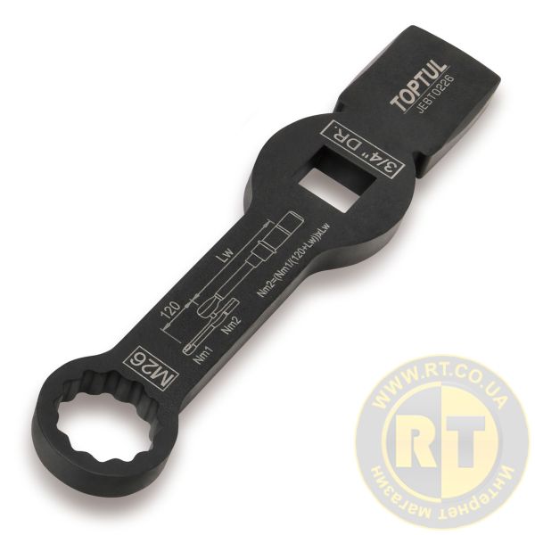 TOPTUL JEBT0226 — специализированный ударный ключ с профилем M26 и квадратом 3/4", предназначенный для демонтажа и монтажа тормозных суппортов на коммерческих автомобилях DAF XF/XF95/XF105/ тягу.