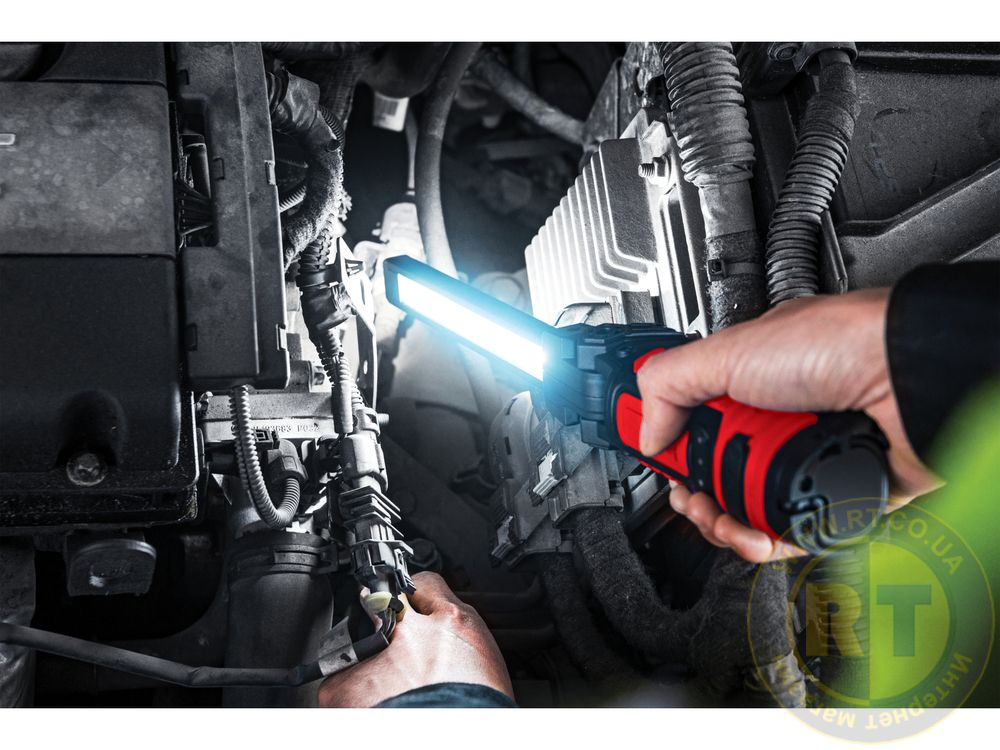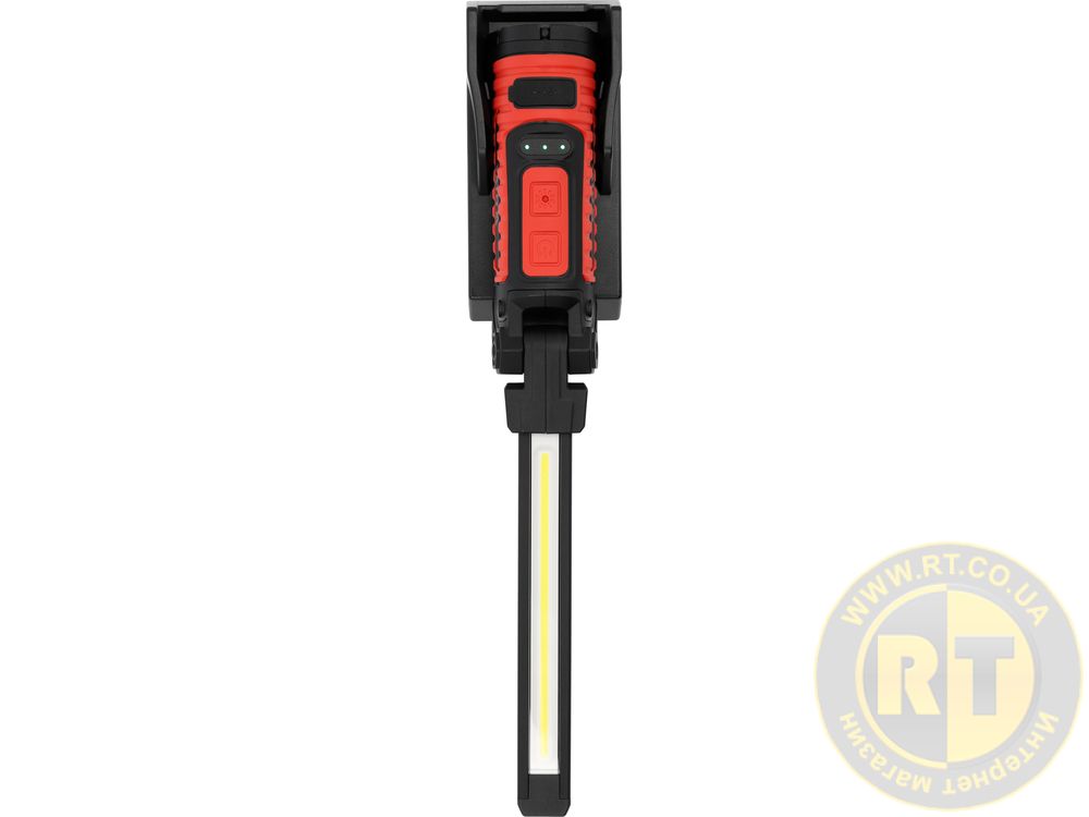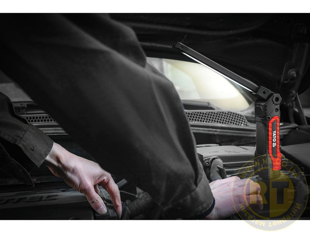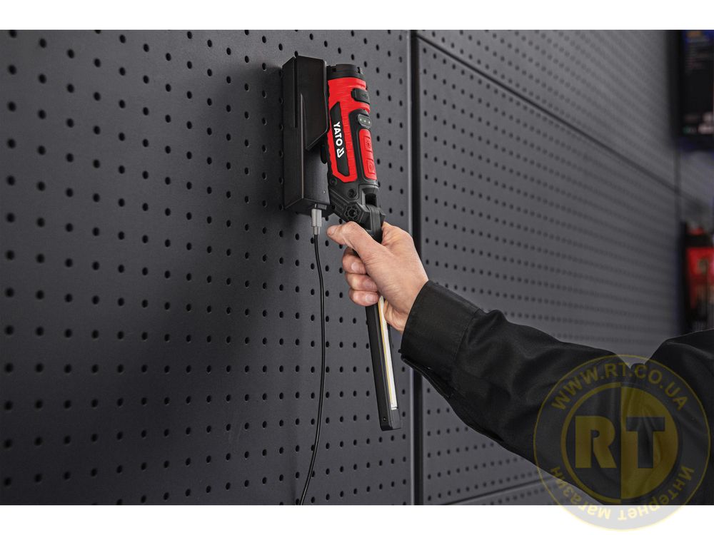 Адаптированный для мастерской корпус оснащен монтажными магнитами и поворотным крючком, что позволяет стабильно размещать или подвешивать фонарь, не занимая рук.
