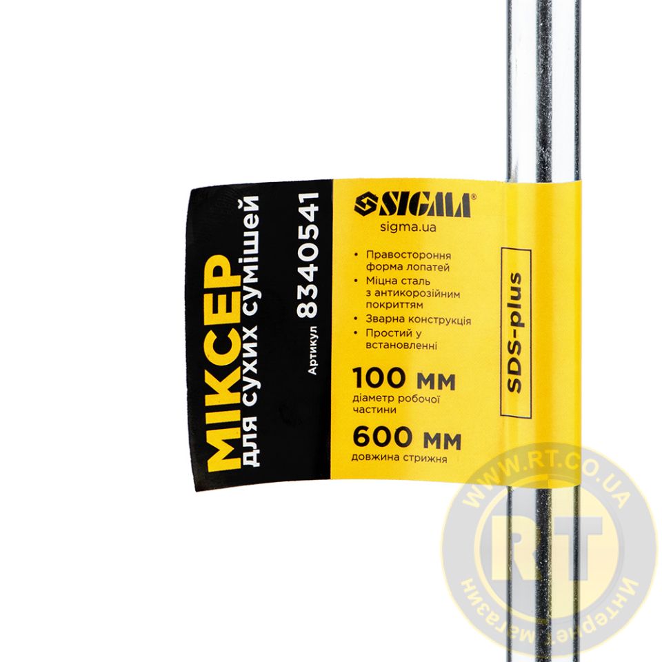 Миксер для сухих смесей SDS-plus 100×600мм SIGMA (8340541) - металева насадка з лопатями, призначена для інтенсивного перемішування сухих, густих та важких будівельних сумішей, таких як штукатурка, шпаклівка, цементні розчини, плитковий клей та піщано-гравійні суміші.