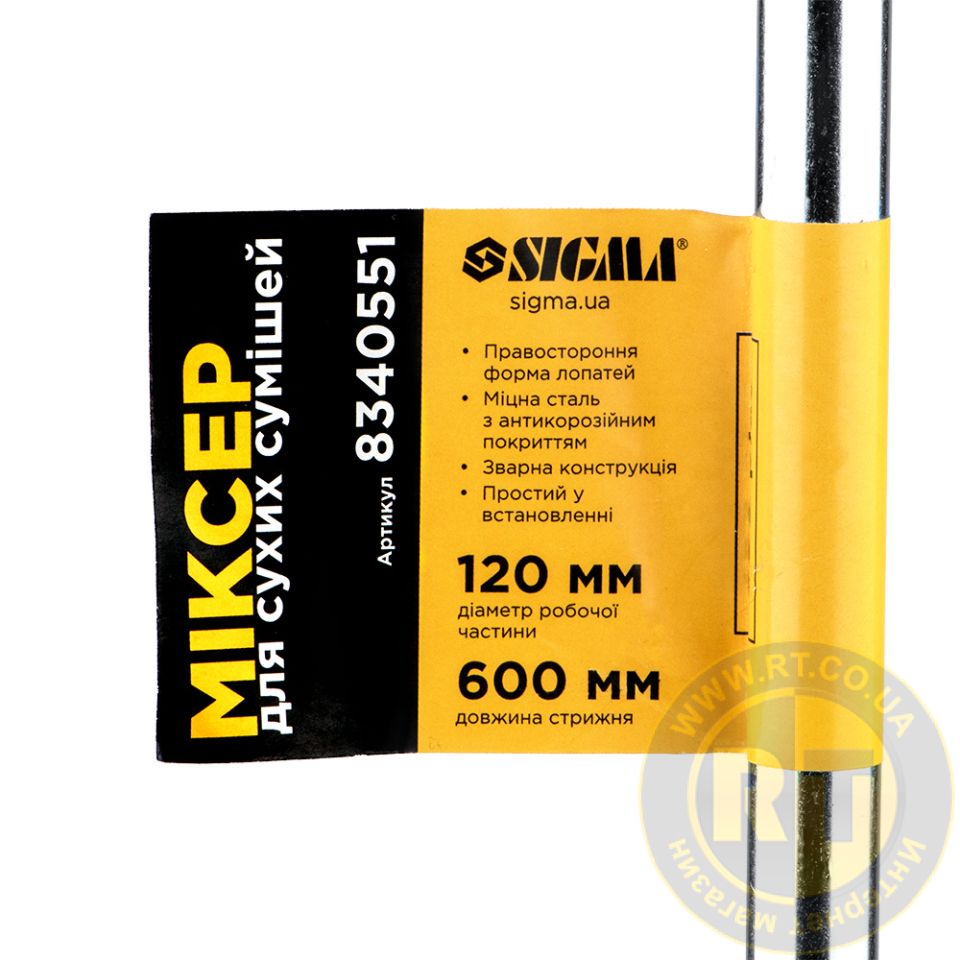 Миксер для сухих смесей SDS-plus 120×600мм SIGMA (8340551) - металева насадка з лопатями, призначена для інтенсивного перемішування сухих, густих та важких будівельних сумішей, таких як штукатурка, шпаклівка, цементні розчини, плитковий клей та піщано-гравійні суміші.