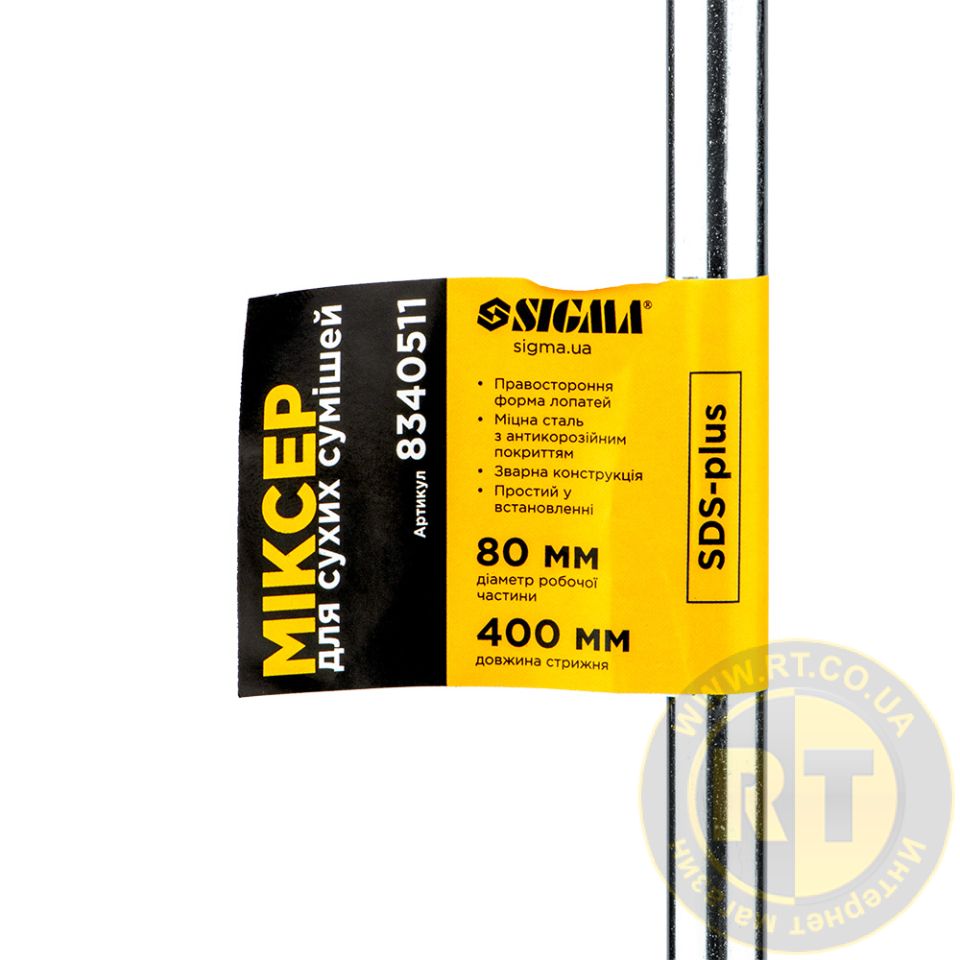 Міксер для сухих сумішей SDS-plus 80×400мм SIGMA (8340511) - металева насадка з лопатями, призначена для інтенсивного перемішування сухих, густих та важких будівельних сумішей, таких як штукатурка, шпаклівка, цементні розчини, плитковий клей та піщано-гравійні суміші.