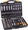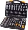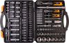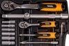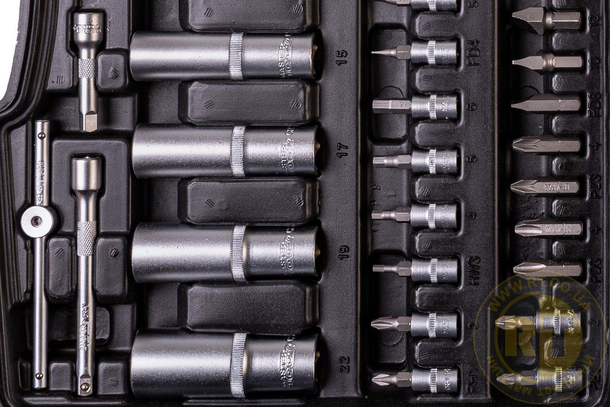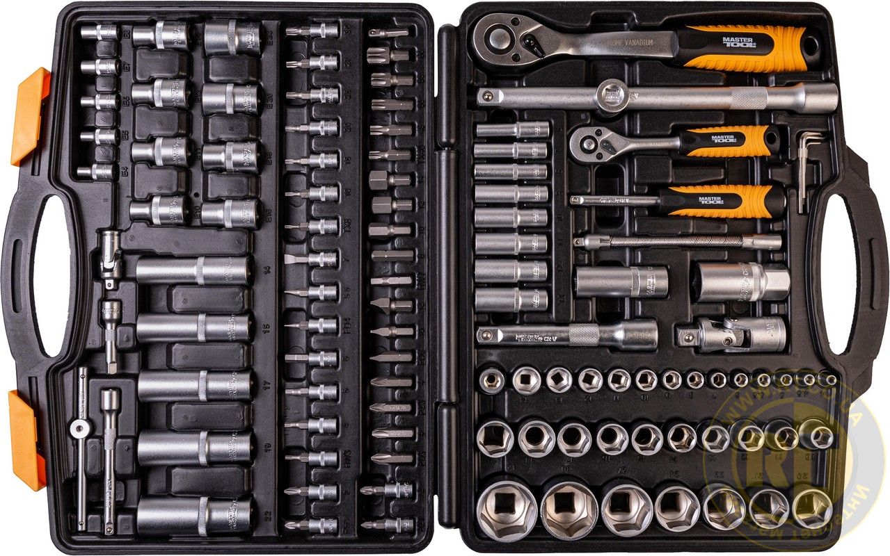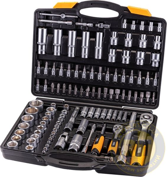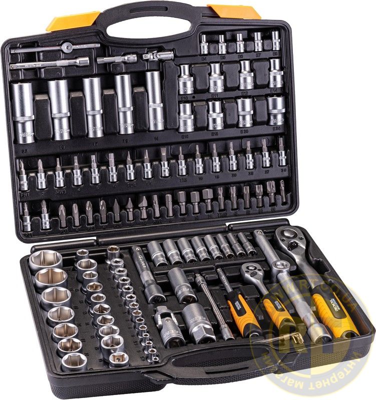 Все элементы набора выполнены из высококачественной хром-ванадиевой стали CrV50BV30, обеспечивающей высокую прочность и устойчивость к износу. Трещоточные ключи с приводами ¼" и ½" имеют точный механизм на 72 зуба, что позволяет работать в стеснённых условиях с минимальным углом возврата. Рукоятки с TPR-покрытием удобно лежат в руке и не скользят. Каждый элемент имеет антикоррозионное покрытие и своё посадочное место в ударопрочном пластиковом кейсе с усиленными петлями и надёжными защёлками – инструмент не болтается и не теряется при транспортировке.