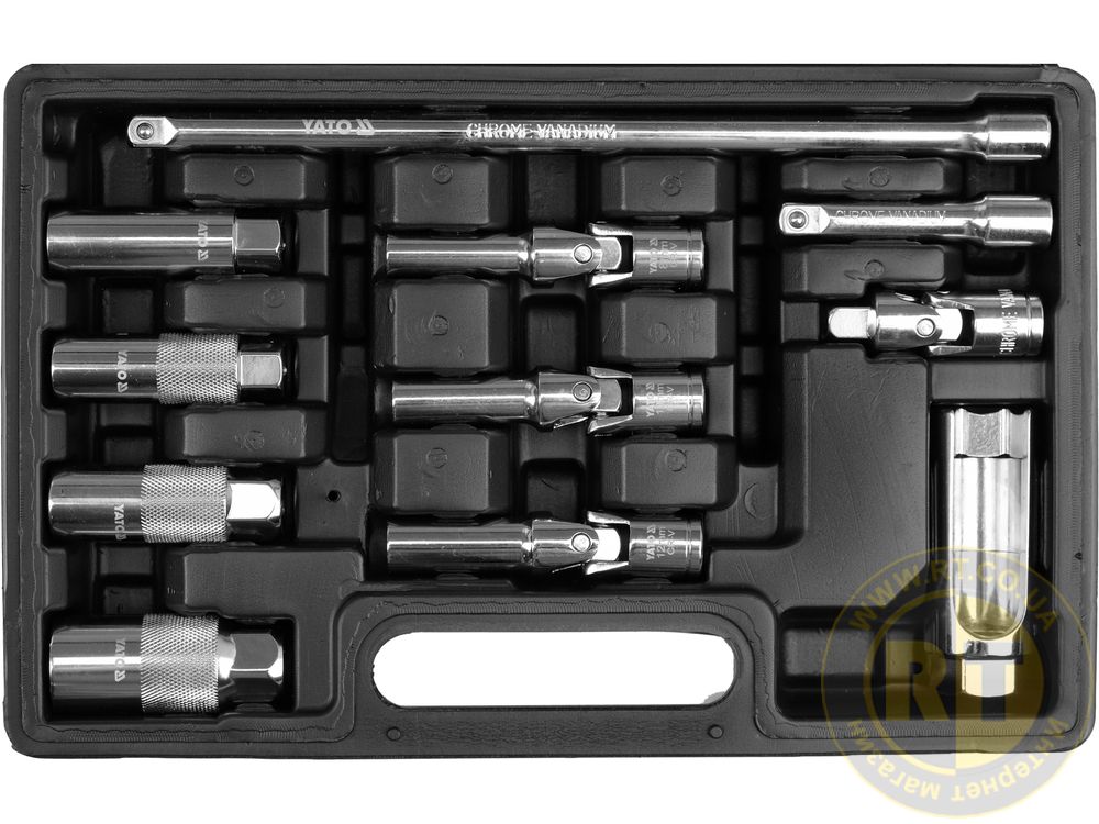 Содержит все необходимые головки и удлинители, адаптированные к большинству современных автомобилей.