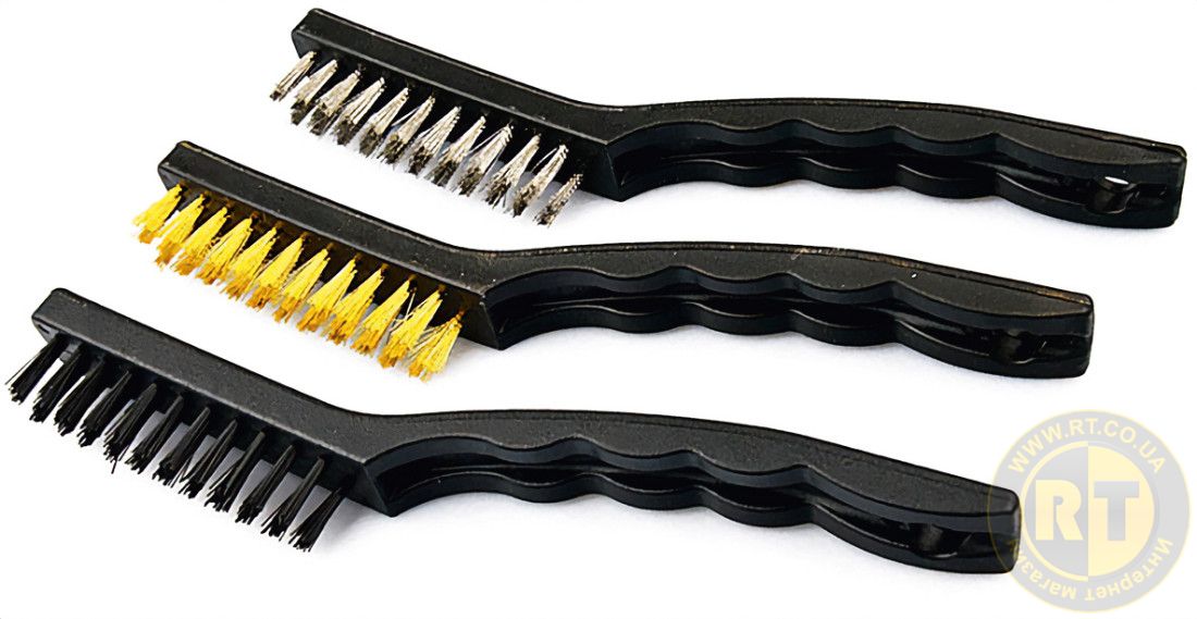 Набор ручных мини-щёток состоит из трёх щёток длиной 220 мм, предназначенных для очистки труднодоступных мест и мелких поверхностей. Идеально подходят для работы с металлом, деревом, пластиком и другими материалами. Эргономичные ручки обеспечивают комфорт при длительной работе.