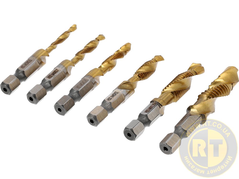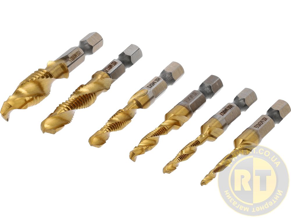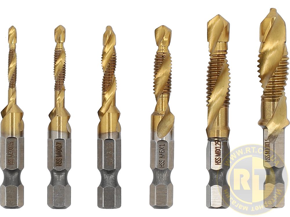 Набор из 6 сверл – метчиков, изготовленных из быстрорежущей стали HSS, что делает сверла чрезвычайно прочными, долговечными и устойчивыми к износу, что позволяет работать на высоких скоростях.