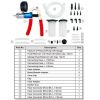 Комплектация: набор шлангов, резервуаров и адаптеров для работы с большинством автомобильных систем.