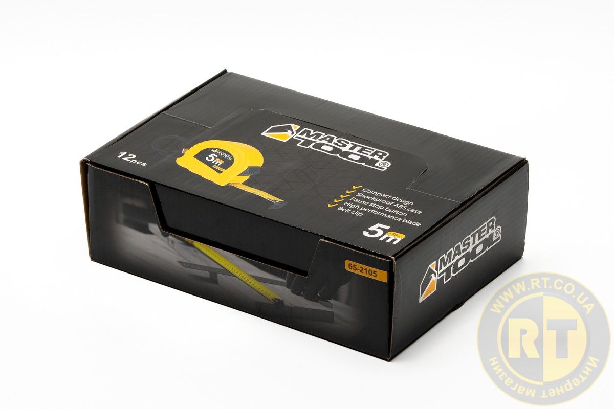 Рулетка 5 м×19 мм фиксатор полотна кнопка STOP противоскользящий крючок 12 шт SHOWBOX MASTERTOOL 65-2105PC