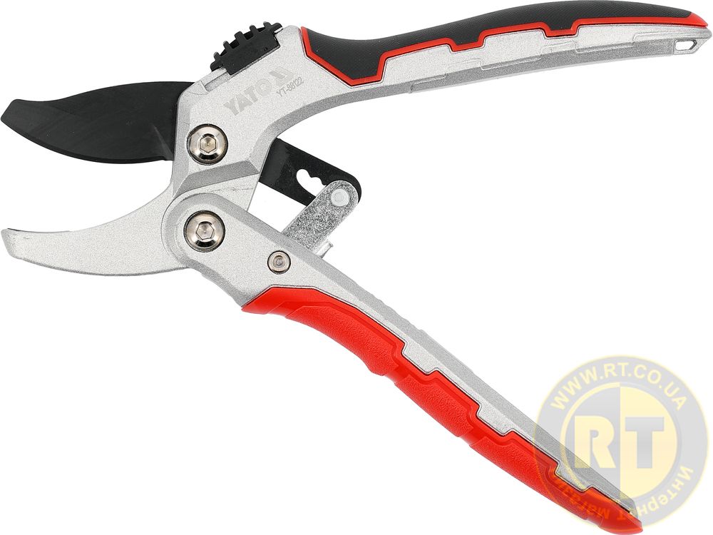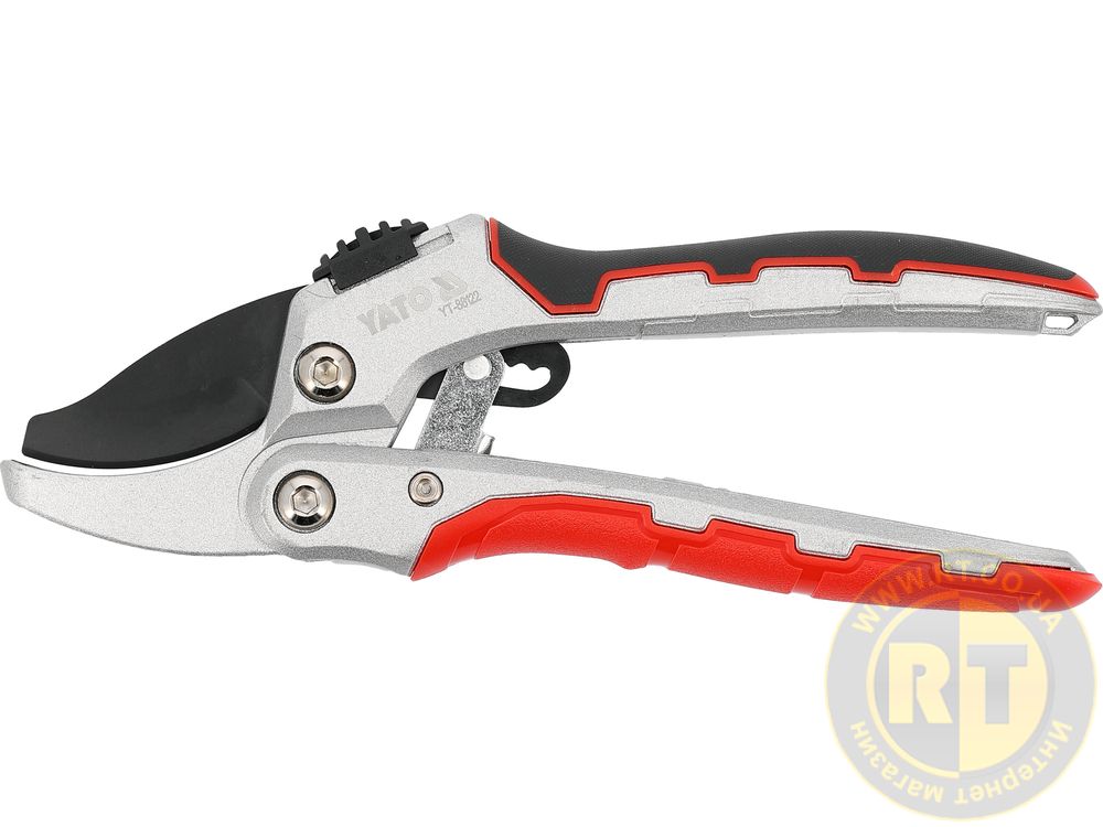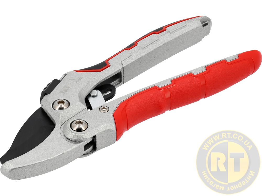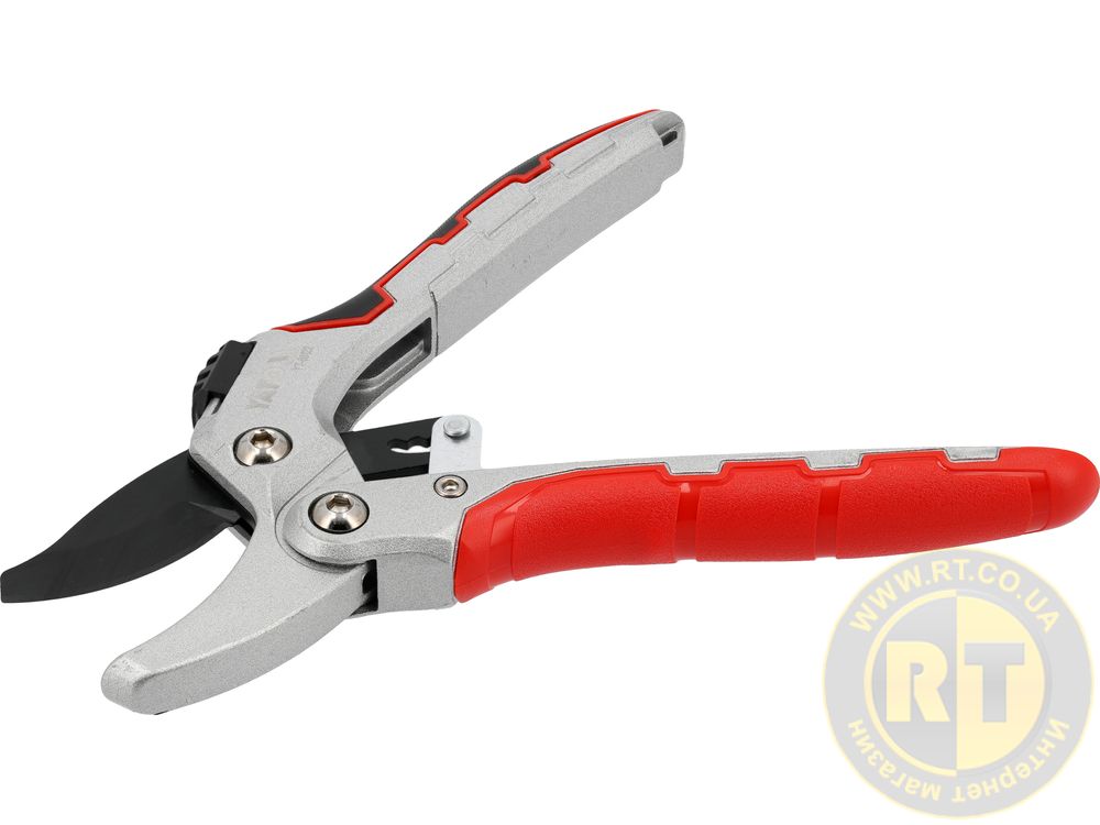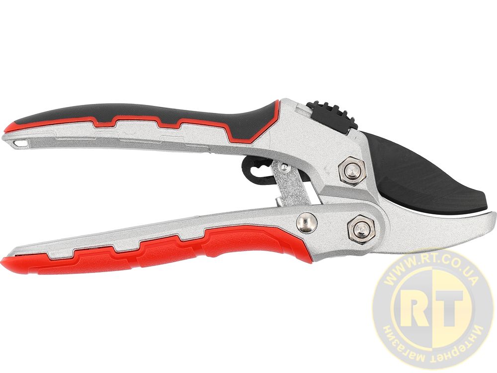 Кованые алюминиевые садовые ножницы, длиной 190 мм, с храповым механизмом, усиливающим силу резки без напряжения рук.