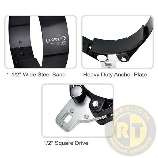 - Усиленная конструкция: стальная лента шириной 1-1/2" обеспечивает прочный захват и устойчивость к деформациям при использовании высокого крутящего момента.