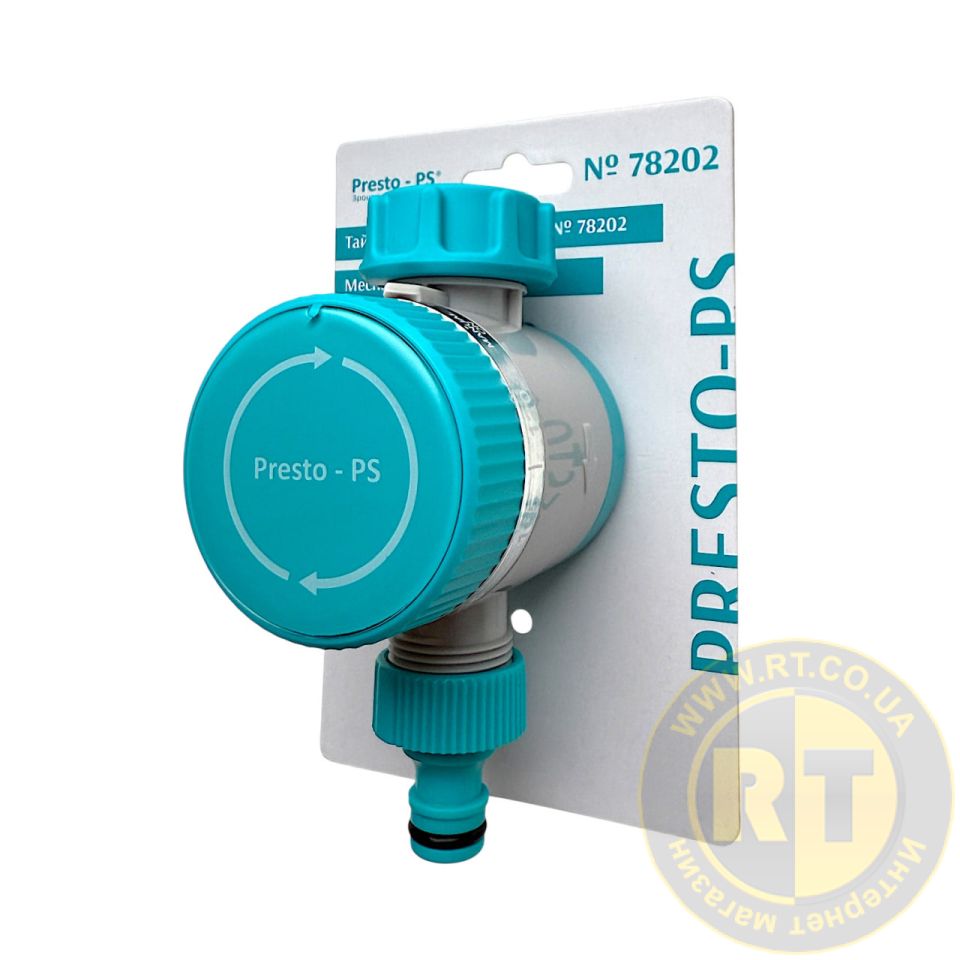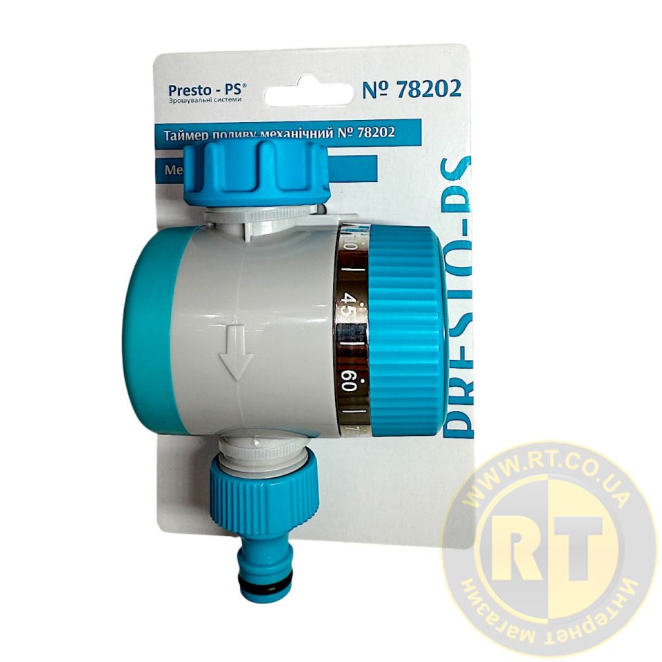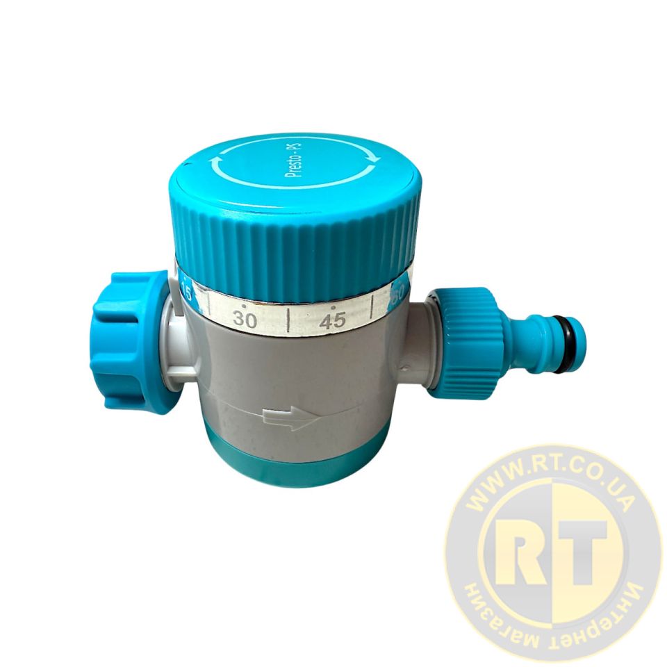 Таймер механічний Presto-PS (78202) застосовується в комбінації зі стандартними конекторами для побудови систем поливу з використанням гнучких садових шлангів і дощовиків. Дає змогу регулювати час поливу в межах від 0 до 120 хвилин. Процес монтажу не займає багато часу і не вимагає великих зусиль. Корпус таймера виготовлений з якісного пластику, довговічний, стійкий до впливу ультрафіолету і розчинів добрив. Елементи, що піддаються навантаженням при монтажі, зроблені металевими. Для продовження терміну служби виробу рекомендується використання в системі подачі води фільтра грубого очищення.