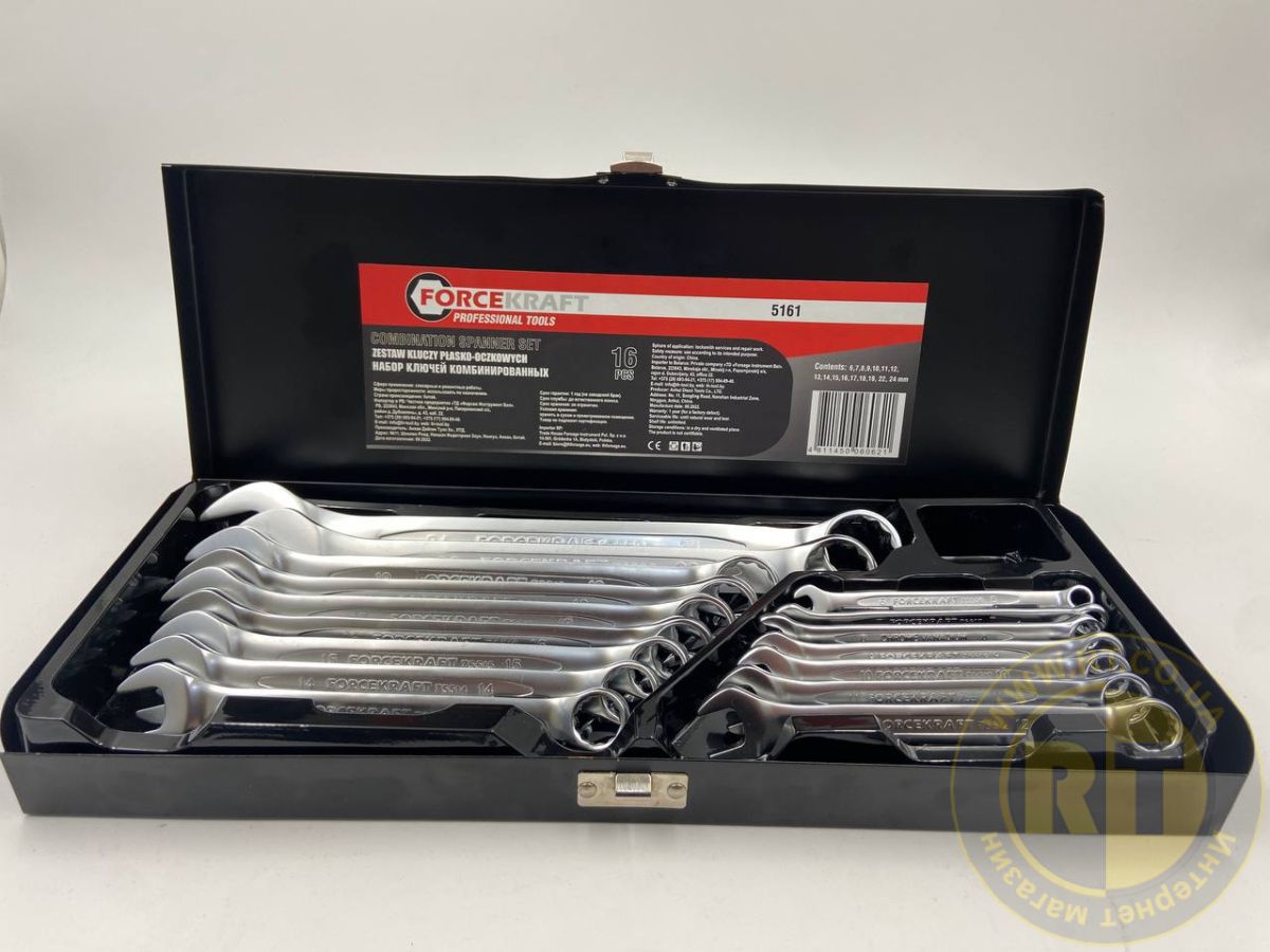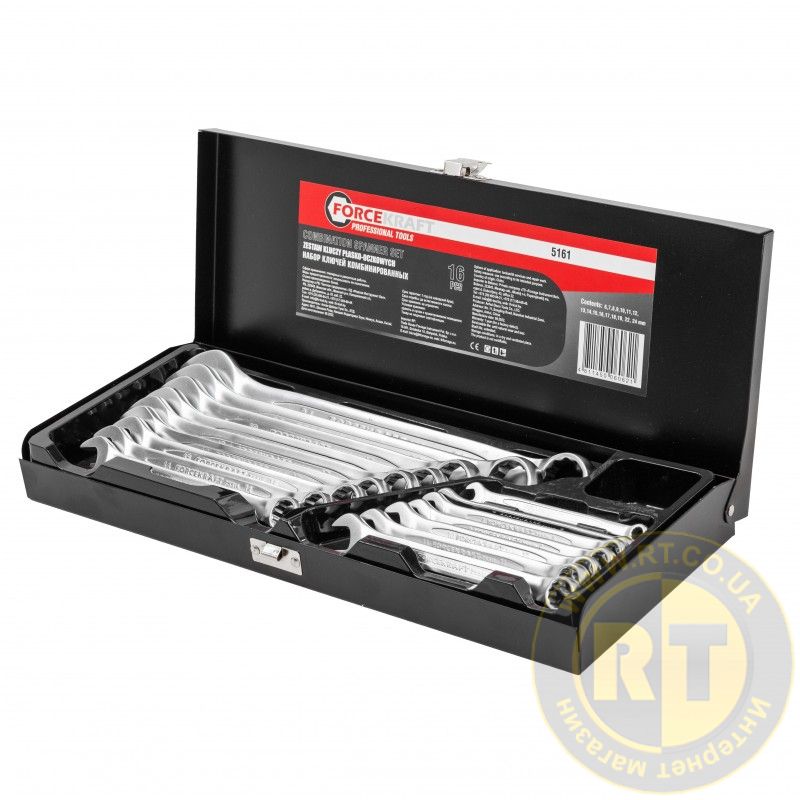 Набір комбінованих ключів FORCEKRAFT FK-5161 включає 16 інструментів розміром 6-24 мм, виконаних зі сталі CrV з покриттям «матовий хром».