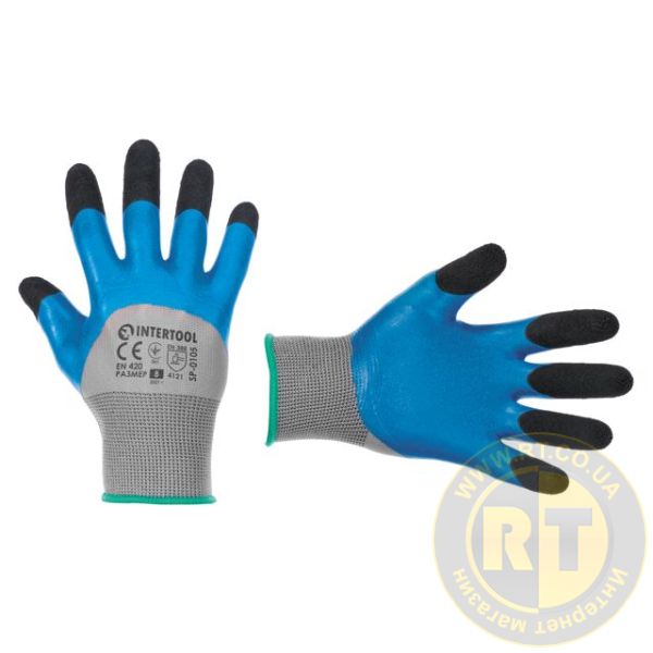 Перчатка трикотажная с 3/4 покрытием из синего вспененного латекса, синтетическая, усиленная, покрытие пальцев: черный морщинистый латекс, 9" INTERTOOL SP-0106