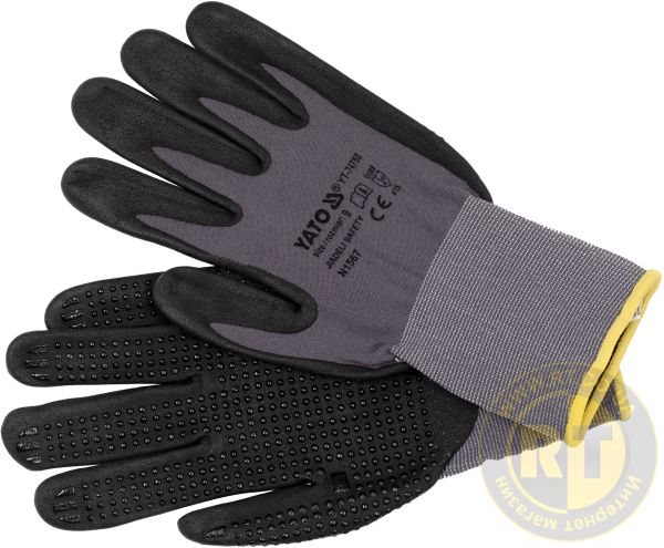 Перчатки рабочие нейлоновые YATO покрытые вспененным нитрилом с накраплением, размер 9, черн-серые.