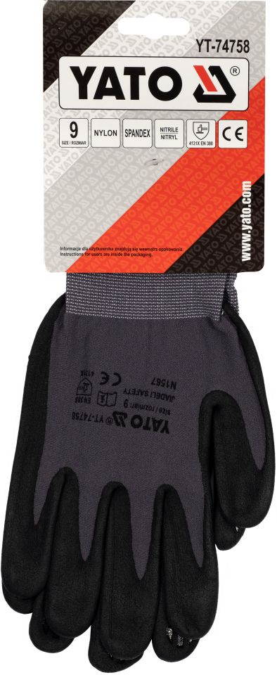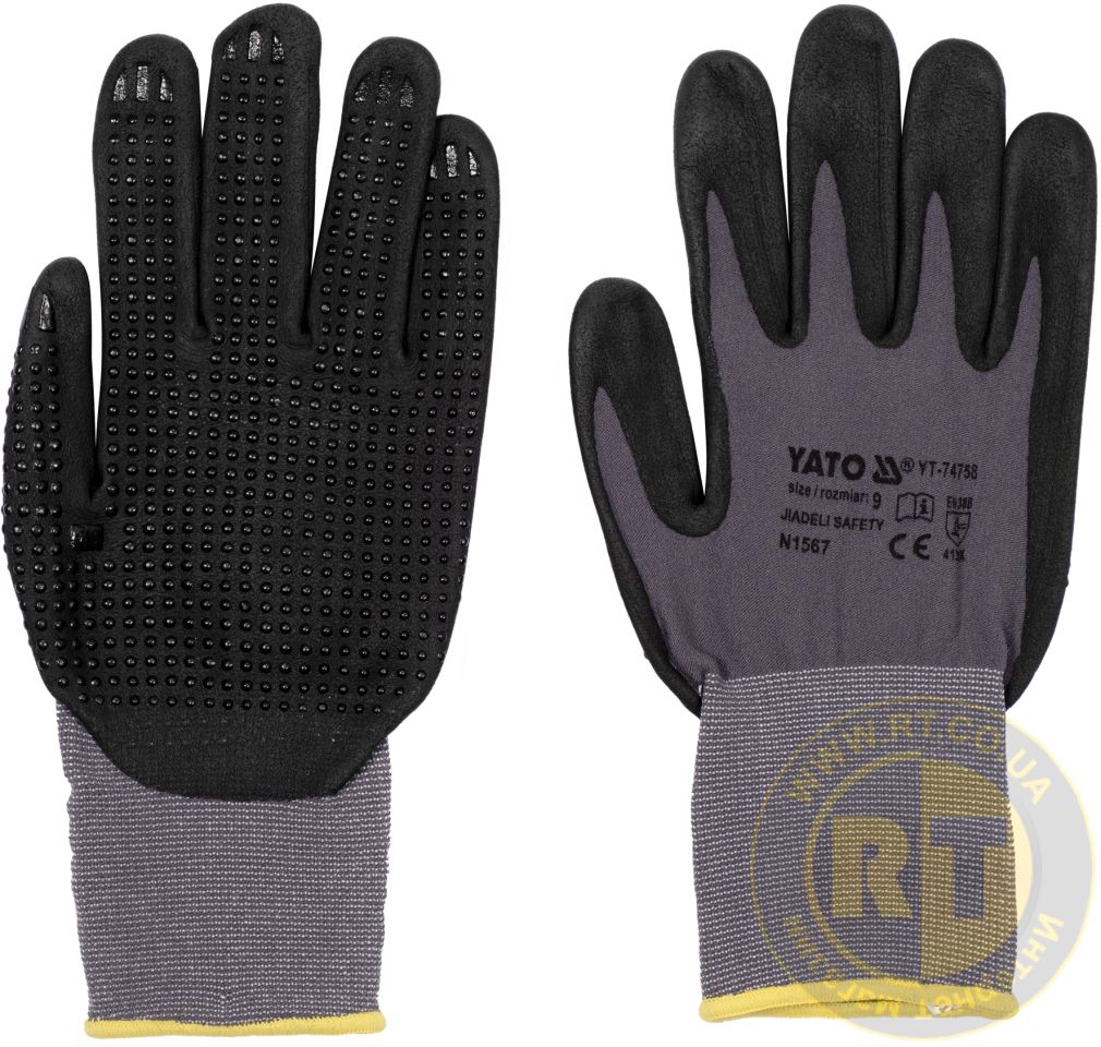 Перчатки рабочие нейлоновые YATO покрытые вспененным нитрилом с накраплением, размер 9, черн-серые.