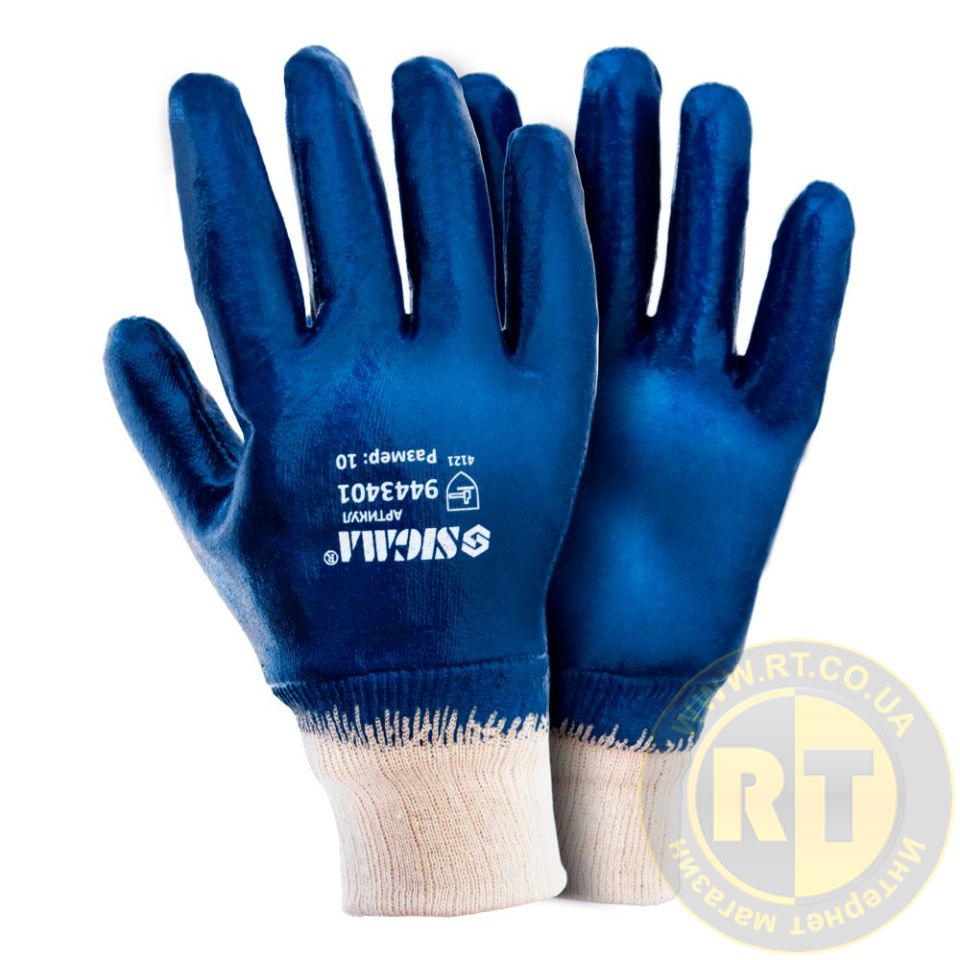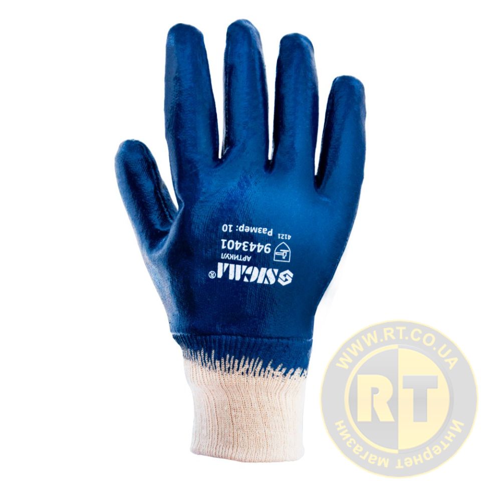 Перчатки трикотажные с нитриловым покрытием р10 (синие манжет) SIGMA (9443401) предназначены для защиты рук от воздействием масел, жиров, нефтепродуктов, а также механических воздействий.