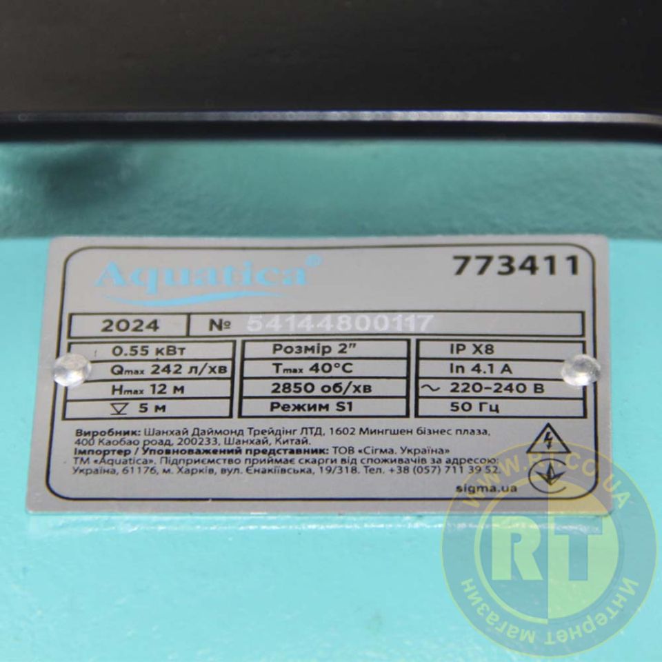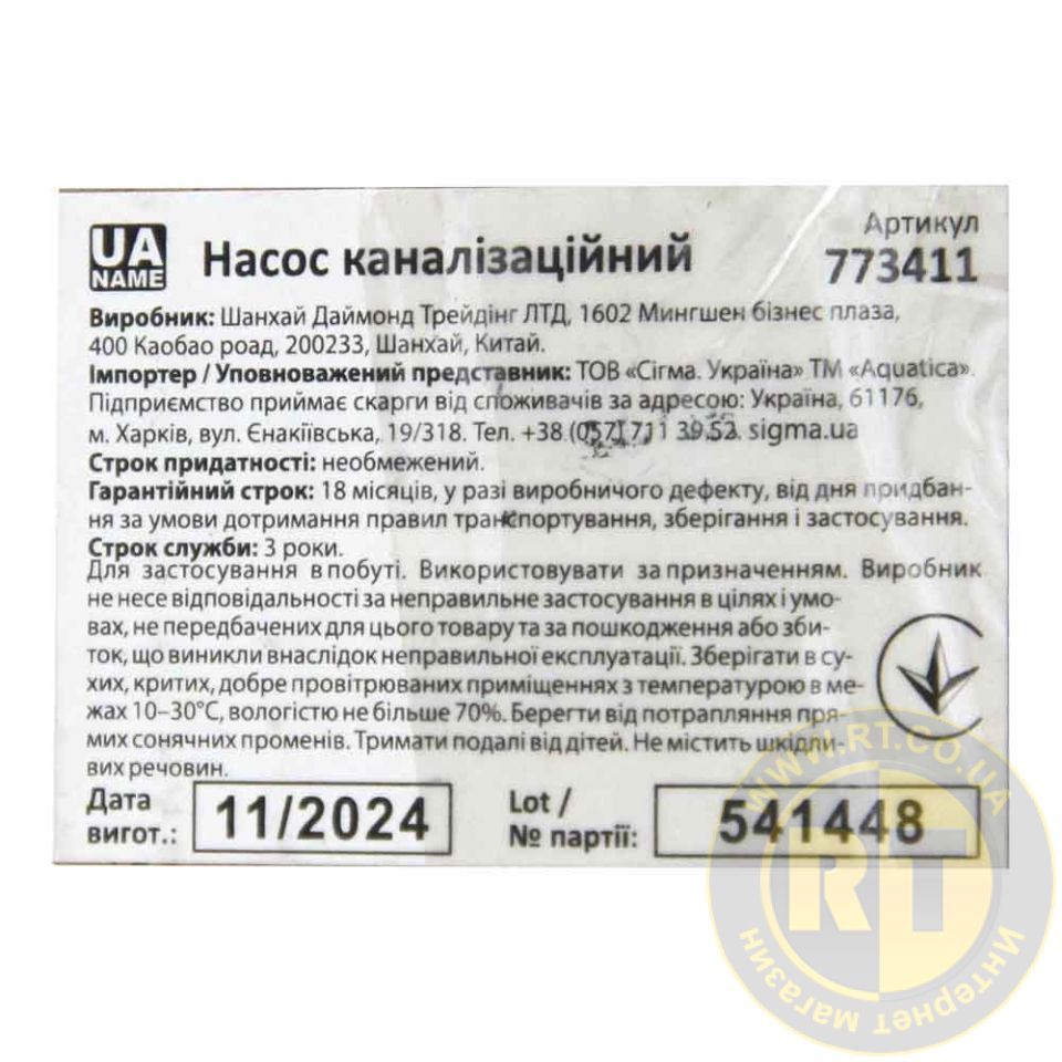Насос канализационный 0.55кВт Hmax 12м Qmax 242л/мин AQUATICA 773411