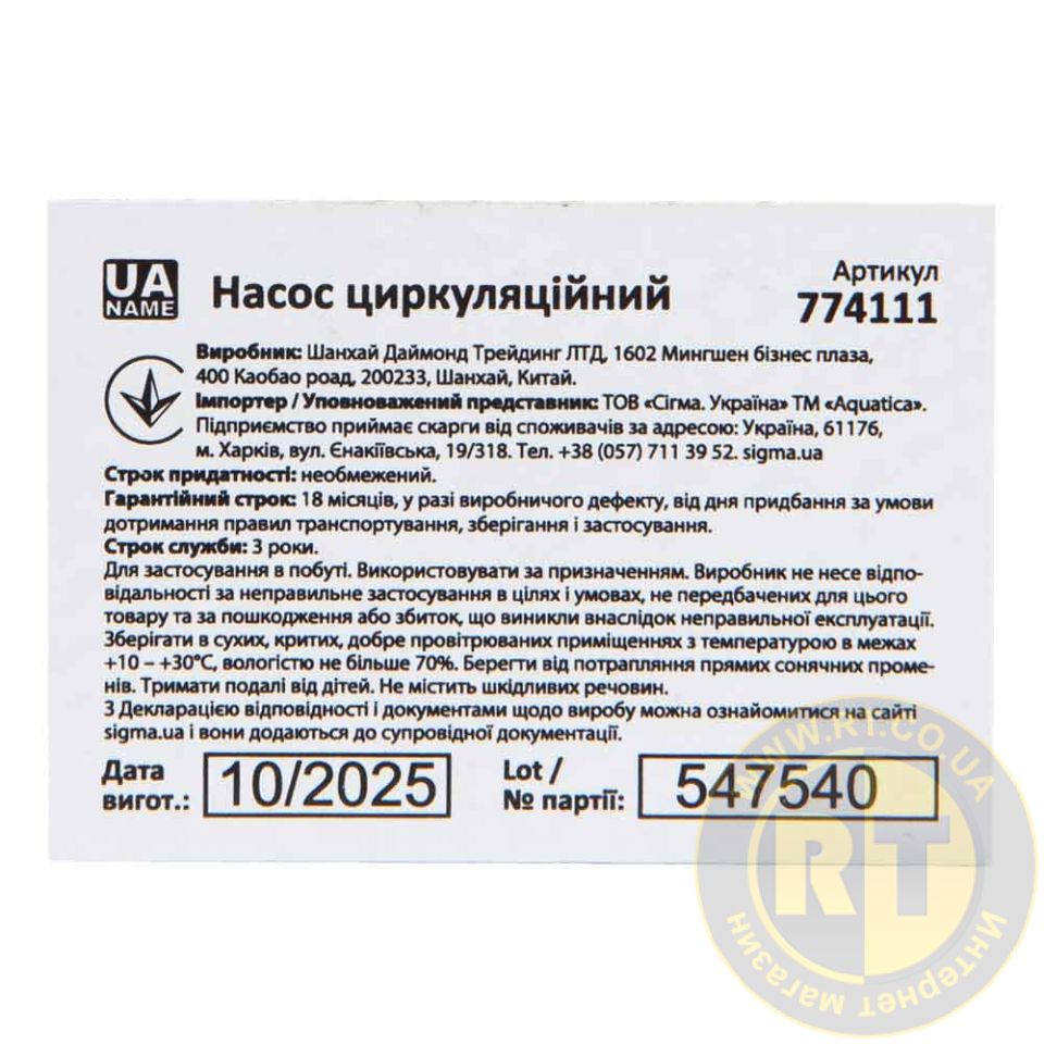 Насос циркуляционный 65Вт Hmax 4м Qmax 63л/мин Ø1" 130мм + гайки Ø¾" AQUATICA 774111