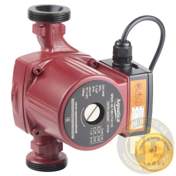 Насос циркуляционный 65Вт Hmax 4м Qmax 63л/мин Ø1½" 180мм + гайки Ø1" AQUATICA 774112