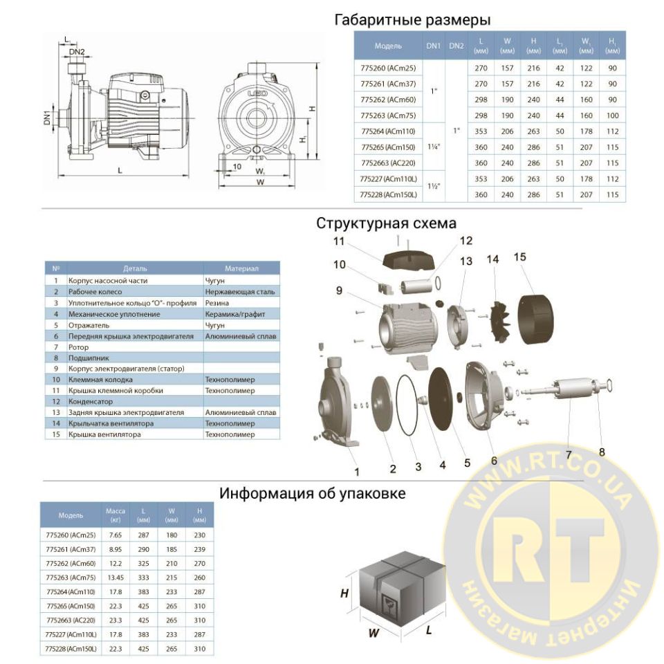 - Рабочее колесо: нержавеющая сталь AISI 304