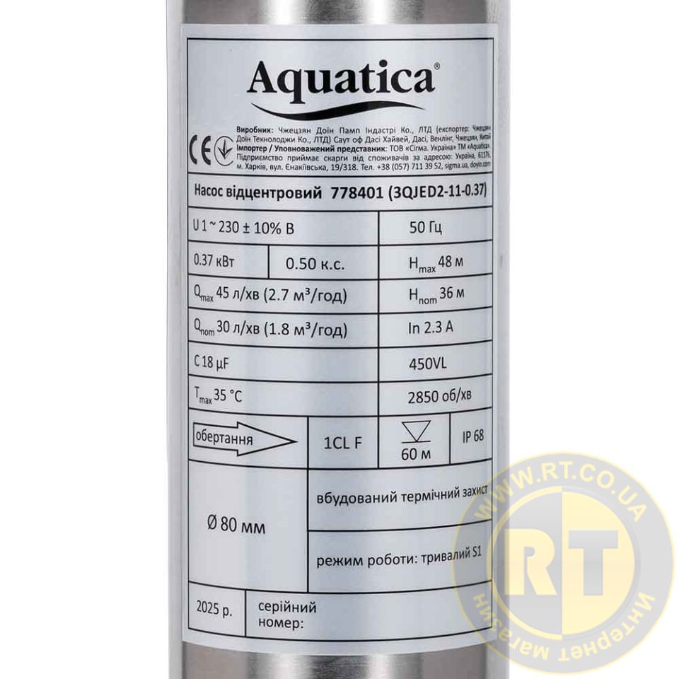 Насос центробежный 0.25кВт H 35(26)м Q 45(30)л/мин Ø80мм 20м кабеля mid AQUATICA 3QJED2-8-0 778400