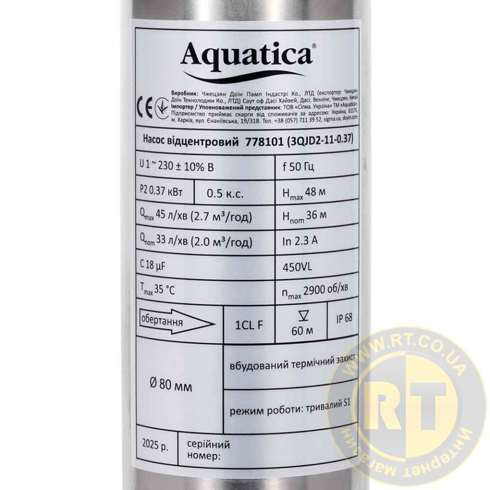 Насос центробежный 0.55кВт H 65(49)м Q 45(30)л/мин Ø80мм mid AQUATICA 3QJD2-15-0.55 (778102)
