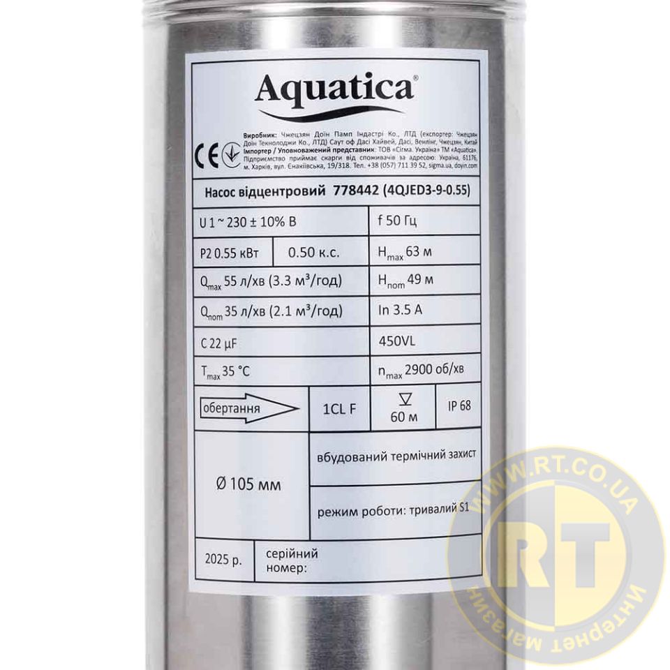 Насос центробежный 0.75кВт H 84(65)м Q 55(35)л/мин Ø102мм 45м кабеля mid AQUATICA 4QJED3-12-0.75 778443