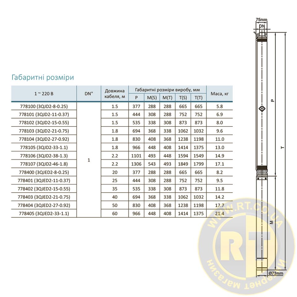 Насос центробежный 1.1кВт H 143(107)м Q 45(33)л/мин Ø80мм 60м кабеля mid AQUATICA 3QJED2-33-1.1 (778405)
