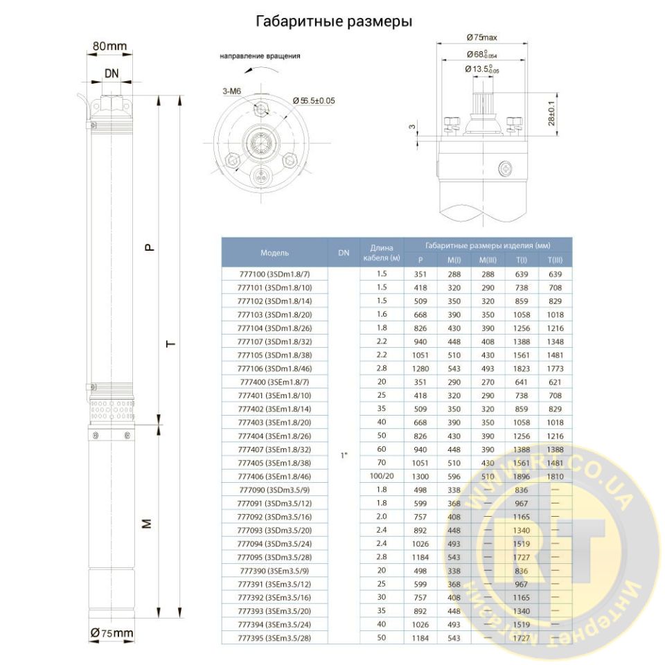 Насос центробежный скважинный 0.75кВт H 62(46)м Q 90(60)л/мин Ø80мм (кабель 30м) DONGYIN 3SEm3.5/16 (777392)