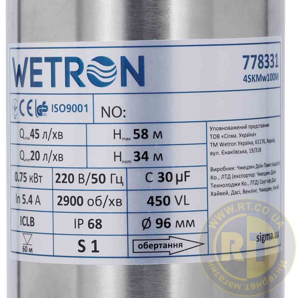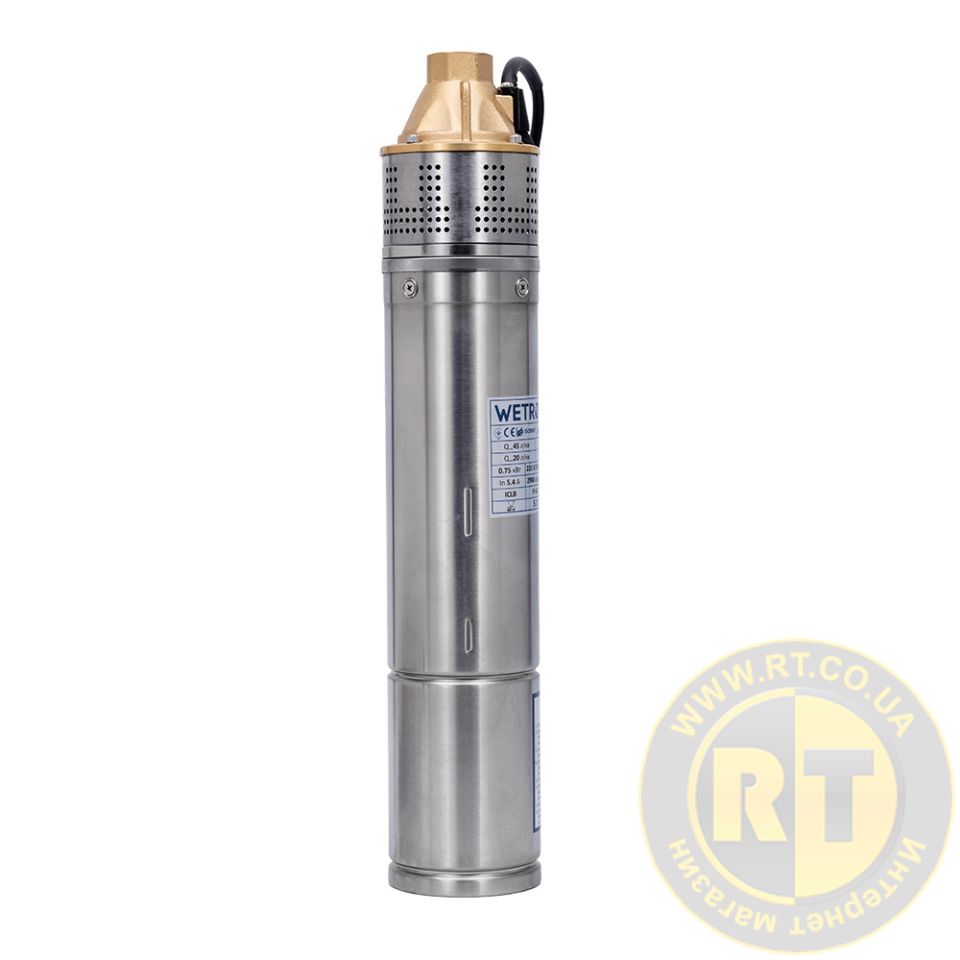 Насос вихревой 1.1кВт H 98(39)м Q 45(30)л/мин Ø96мм 10м кабеля WETRON 4SKmw150M (778332)