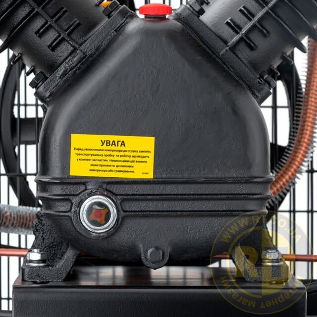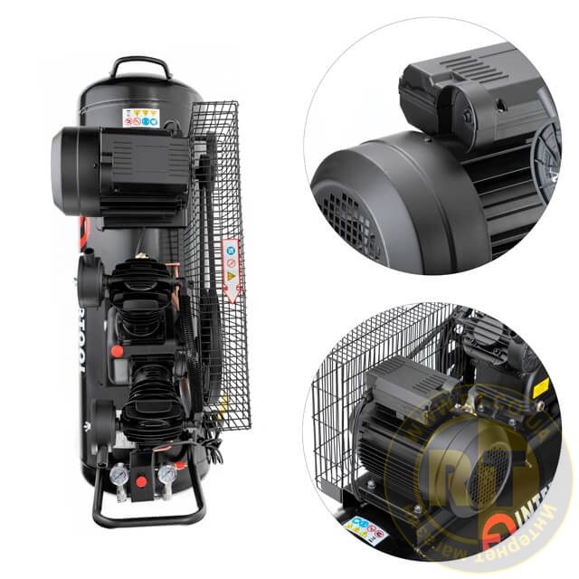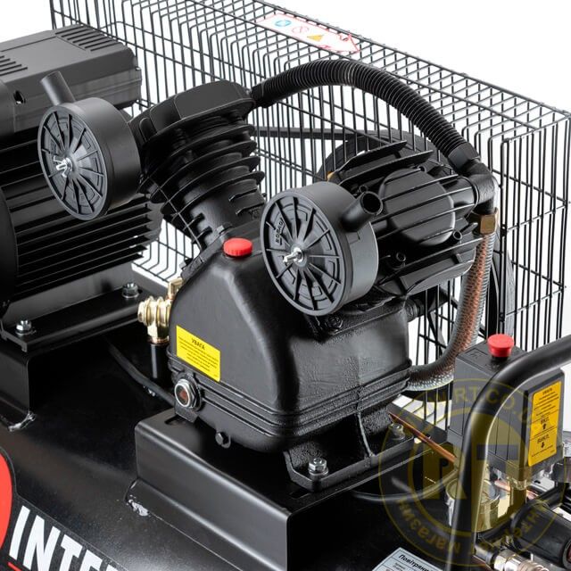 Компрессор имеет ременной привод от электродвигателя к головке с двумя стальными цилиндрами. Это обеспечивает эффективное охлаждение и уменьшает нагрузку на двигатель. Медная обмотка двигателя увеличивает ресурс службы, повышает прочность и выносливость компрессора, что подтверждает 3 года гарантии.