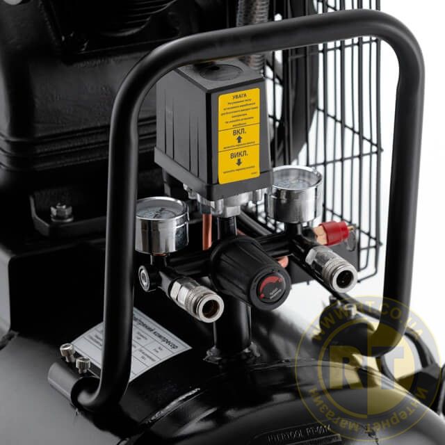 Для того, что бы можно было контролировать давление в ресивере и давление на выходе, компрессор оснащен двумя манометрами и регулятором выходного давления. Регулятор давления с манометром позволяет регулировать и постоянно поддерживать выходное давление необходимое вашему инструменту или оборудованию.