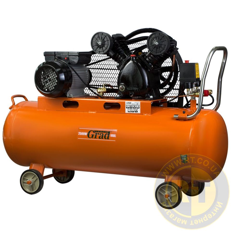 Компрессор двухцилиндровый ременной (V) 2.5кВт 378л/мин 8бар 100л (2 крана) GRAD (7044185) - современное устройство для нагнетания воздуха под давлением. Модель оборудована фильтром входящего воздуха для защиты внутренних узлов от пыли и грязи.