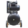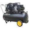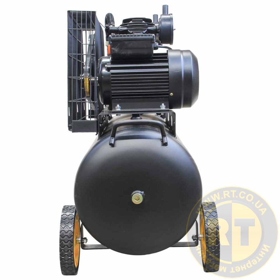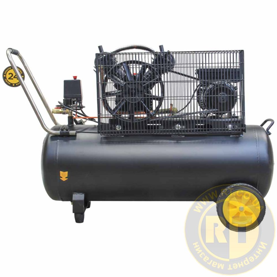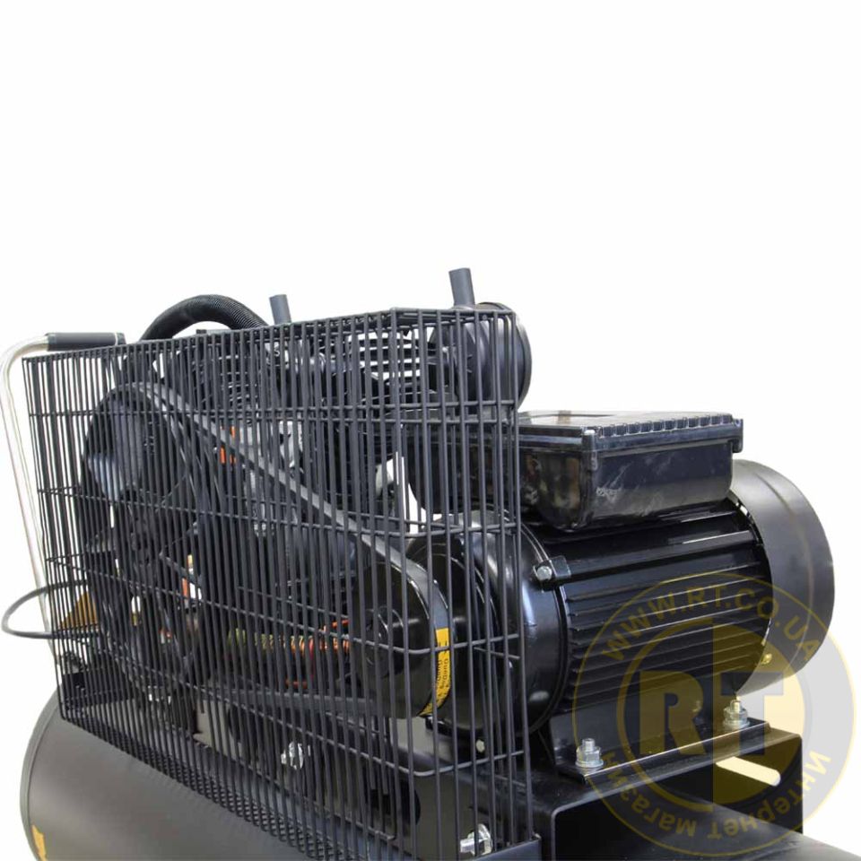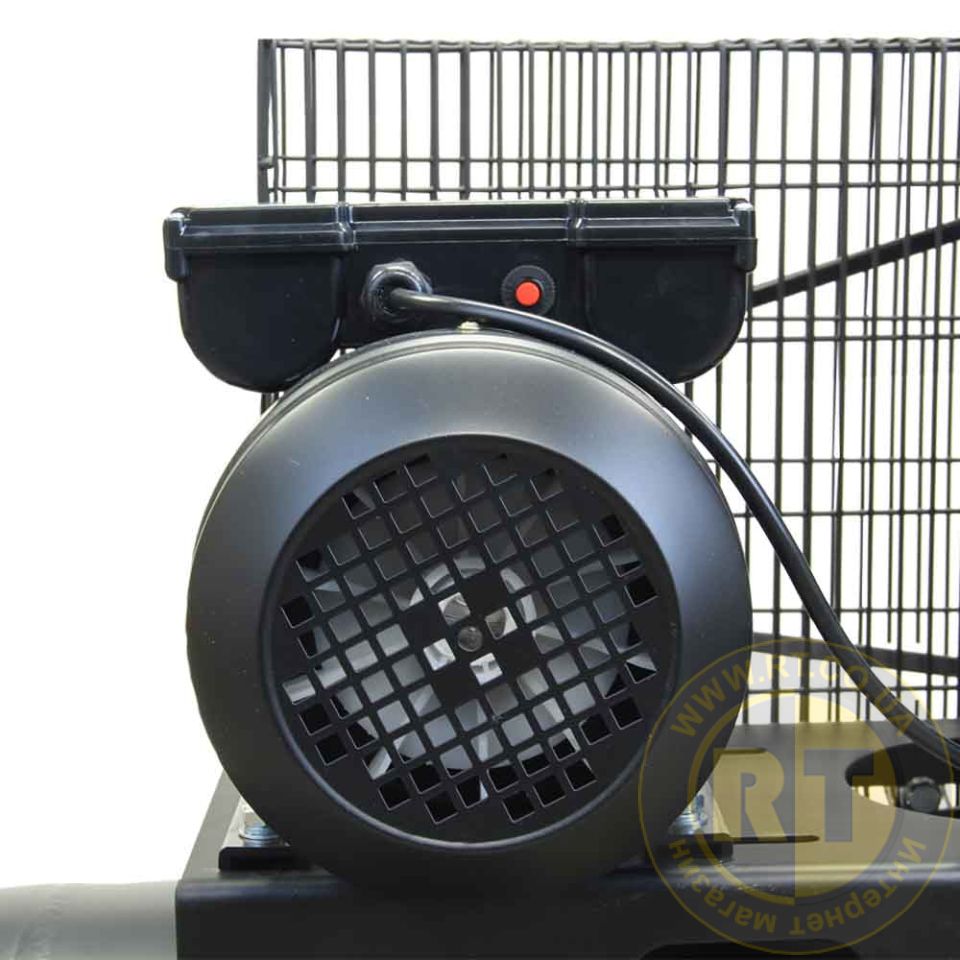 Ременной привод компрессора закрыт металлическим кожухом, который предотвращает от попадания посторонних предметов. Опорная ножка обеспечивает устойчивое положение на поверхности, а резиновая подушечка снижает уровень вибрации.