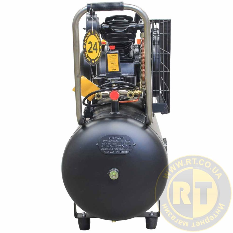 Ресивер емкостью 100 л позволяет накапливать больший объем сжатого воздуха, что значительно уменьшает частоту включения двигателя, снижая нагрузку на компрессор и, соответственно, увеличивает срок его службы.