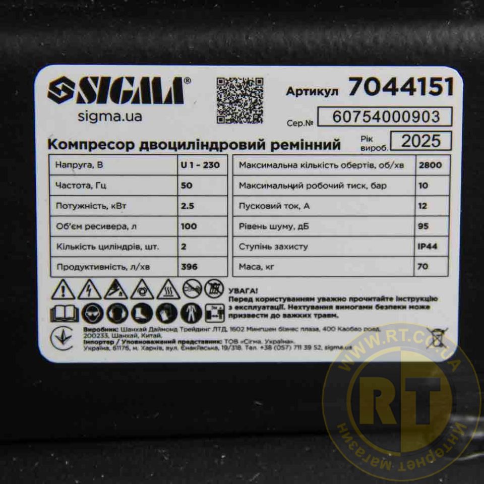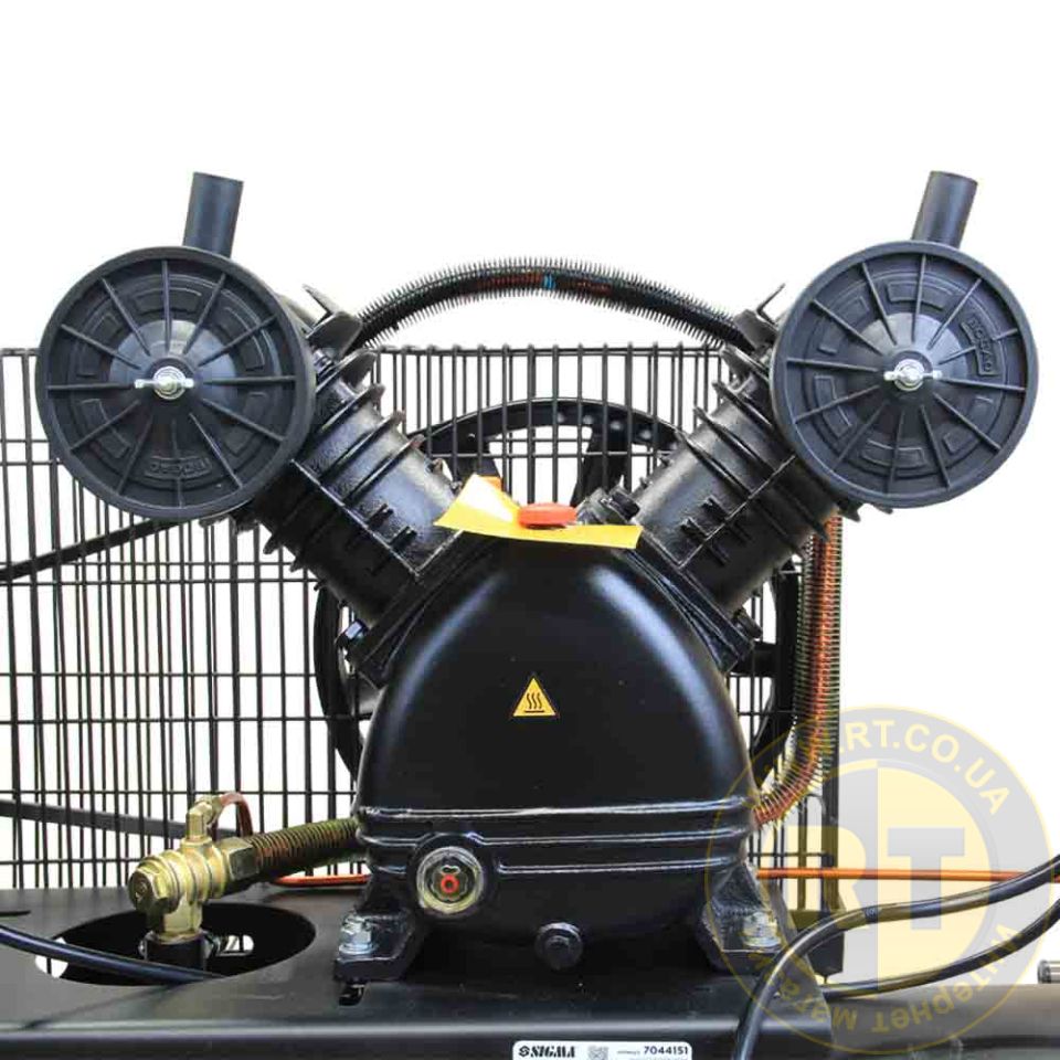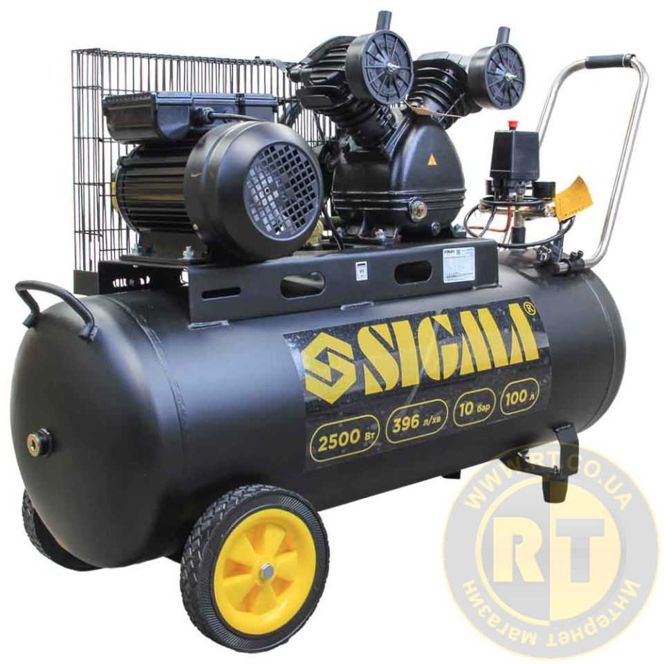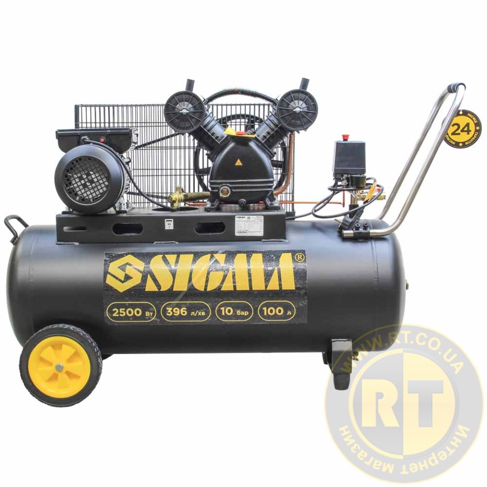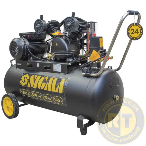 Компрессор двухцилиндровый ременной (V) 2.5кВт 396л/мин 10бар 100л (2 крана) SIGMA 7044151