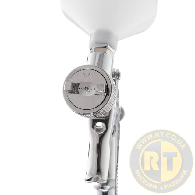 Покрасочный пистолет имеет три настройки и позволяет вам более точно отрегулировать подачу воздуха, подачу краски и настроить форму факела. Оснащен пластиковым бачком ёмкостью 600 мл, благодаря чему есть возможность визуально контролировать уровень краски, что очень удобно. При необходимости бачок можно заменить на новый аналогичный PT-1901 или металлический PT-1906. Дюза 1,4 мм позволяет работать с большинством ЛКМ средней вязкости.