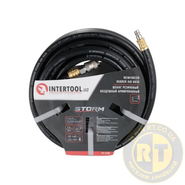 Шланг резиновый воздушный армированный STORM, 20 атм, 15 м, 10*17 мм, с быстроразъемными соединениями INTERTOOL PT-1739