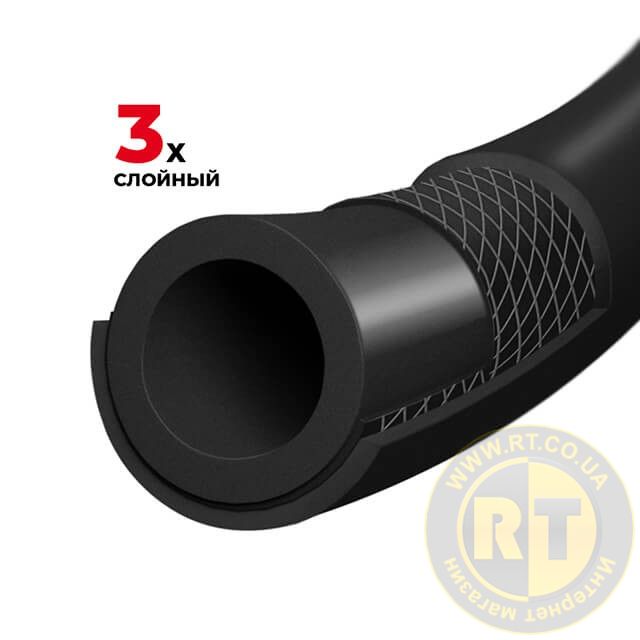 Три слоя шланга делают его устойчивым к низким и высоким температурам, износоустойчивым, маслостойким. Резиновые шланги стойкие к изломам и механическим повреждениям. Остаются эластичными при низких температурах. Температура эксплуатации от -30°С до +60°С.