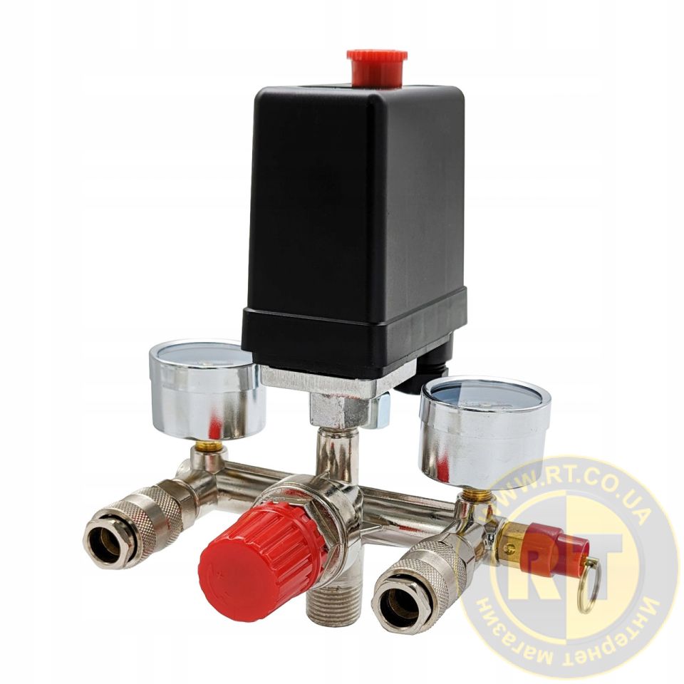 Прессостат, или реле давления (блок управления), предназначен для контроля давления в ресивере компрессора по заданным параметрам в автоматическом режиме. Используется для однофазных воздушных поршневых компрессоров с напряжением 380 В, максимальной мощностью до 3 кВт.