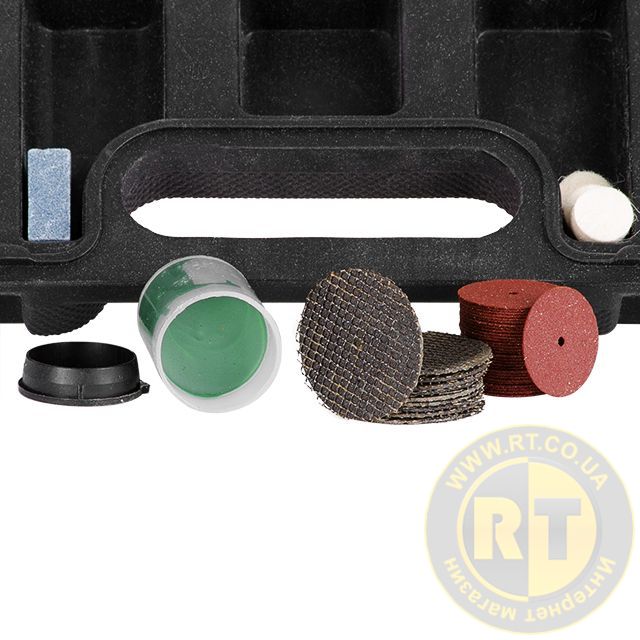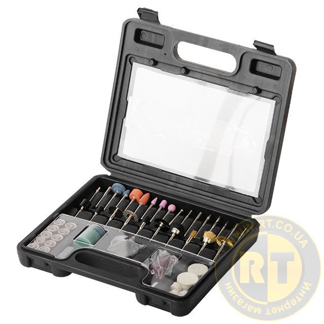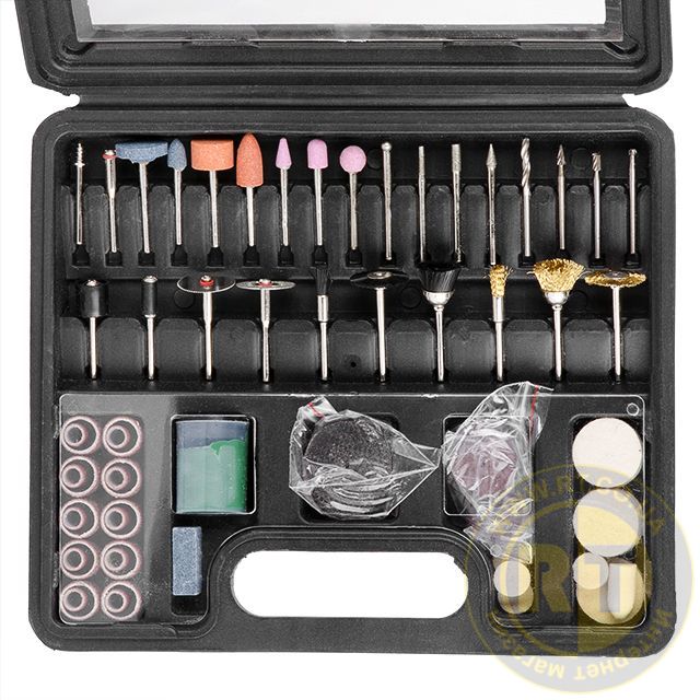 Набор состоит из 100 различных насадок для бормашины или гравера, используется для работы по дереву, камню, металлу, пластику. Большое разнообразие насадок позволяет проводить различные работы по зачистке, отрезанию, шлифованию и полировке поверхностей различных форм.