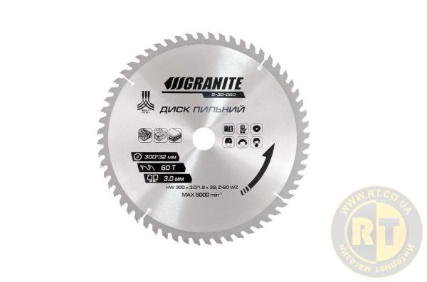 Диск пильный для дерева с твердосплавными напайками 300×32×60Т адапт 32-30/32-25.4 5100 об/мин MASTERTOOL 5-30-060