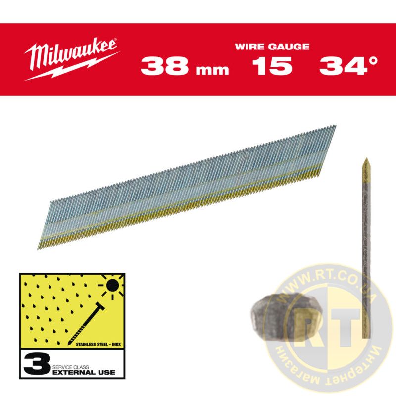 Гвозди из нержавейки с D-образной головкой MILWAUKEE, 15G/34°/38мм, (2500шт)