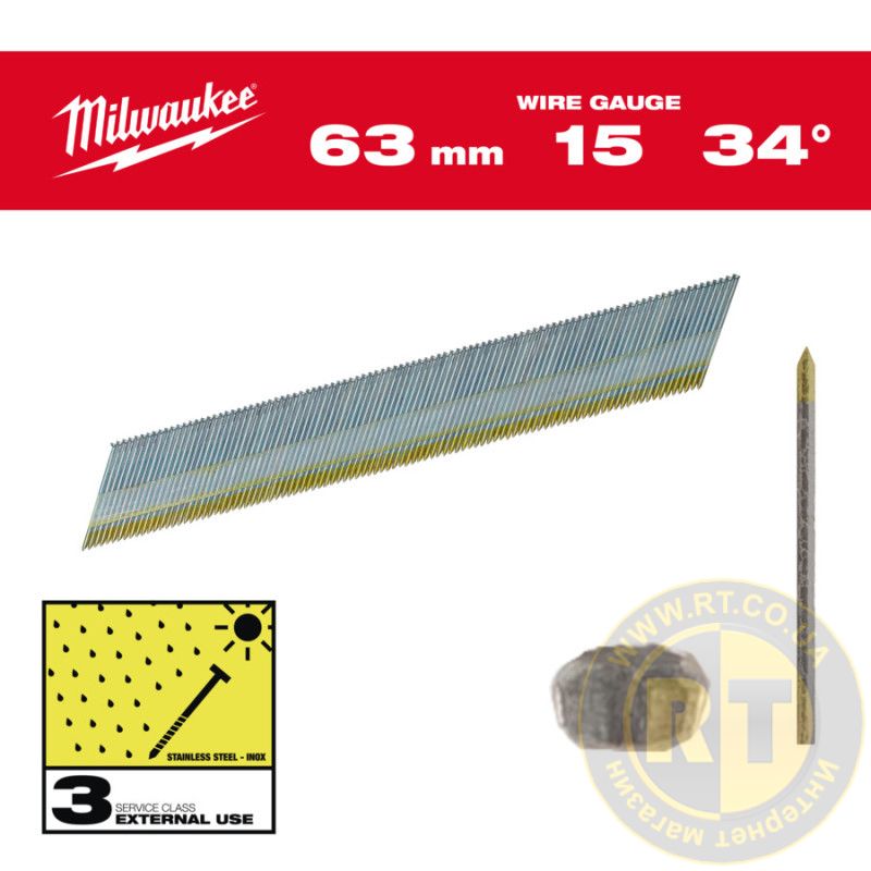Гвозди из нержавейки с D-образной головкой MILWAUKEE, 15G/34°/63мм, (2200шт)