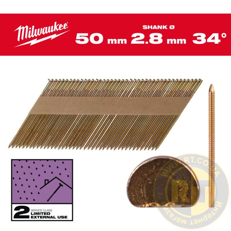 Гвозди оцинкованные с кольцевой накаткой и D-образной головкой MILWAUKEE, 2,8/34°/50мм (2200шт)