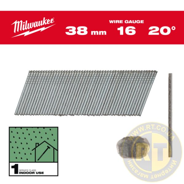 Гвозди оцинкованные с Т-образной головкой MILWAUKEE, 16G/20°/38мм, (2000шт)