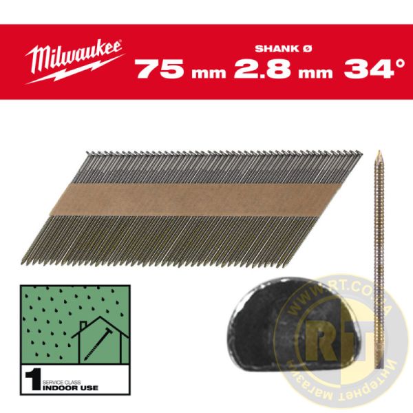 Гвозди с кольцевой накаткой и D-образной головкой MILWAUKEE, 2,8/34°/75мм (2200шт)