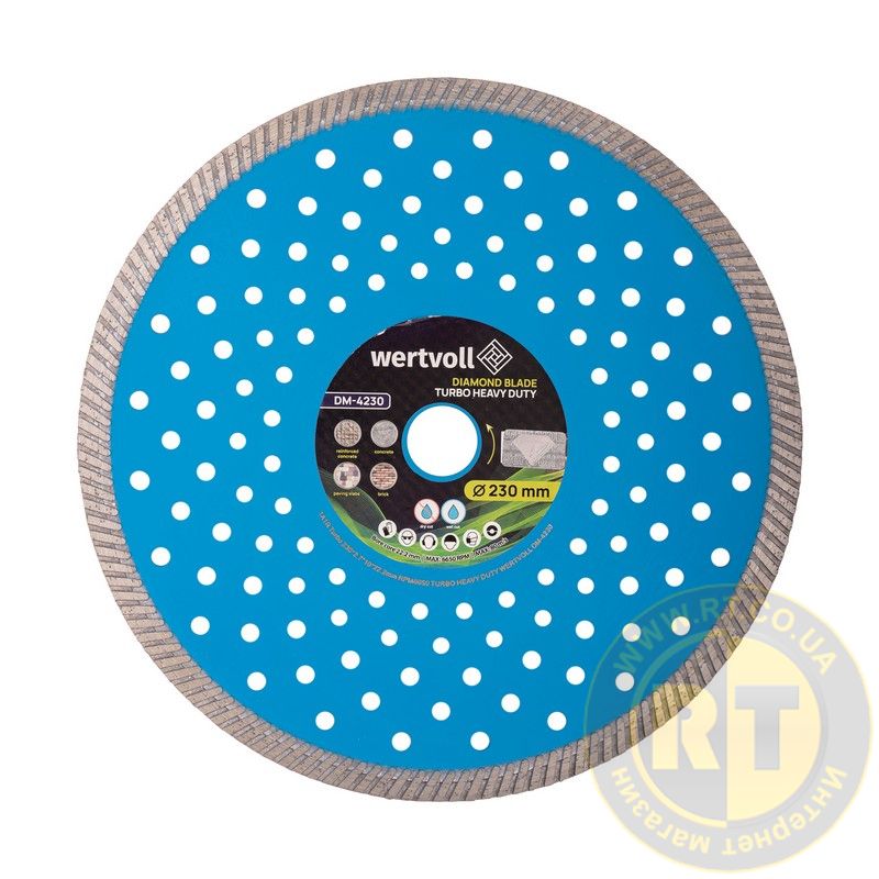диск по армированному бетону, алмазный диск heavy duty, диск по железобетону, turbo 230 мм, диск для резчика швов, диск для штробореза, WERTVOLL, DM-4230, алмазный слой 10 ммАлмазный диск для армированного бетона TURBO HEAVY DUTY 230×2,5 мм, h=10 мм, >24%, адаптер 22,2–20 мм, 6650 об/мин WERTVOLL (DM-4230)