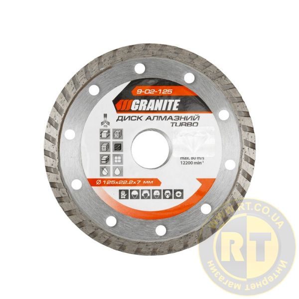 алмазный диск, турбо диск, диск 125 мм, диск по бетону, GRANITE, TURBO, диск для болгарки, 9-02-125Алмазный диск TURBO 125×2,2 мм 22–24% 12 200 об/мин GRANITE